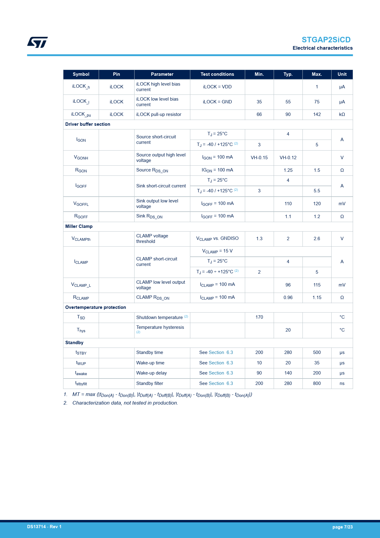 STGAP2SiCD. Electrical characteristics. Symbol. Pin. Parameter. Test conditions. Min. Typ. Max. Unit. Driver buffer section. Miller Clamp