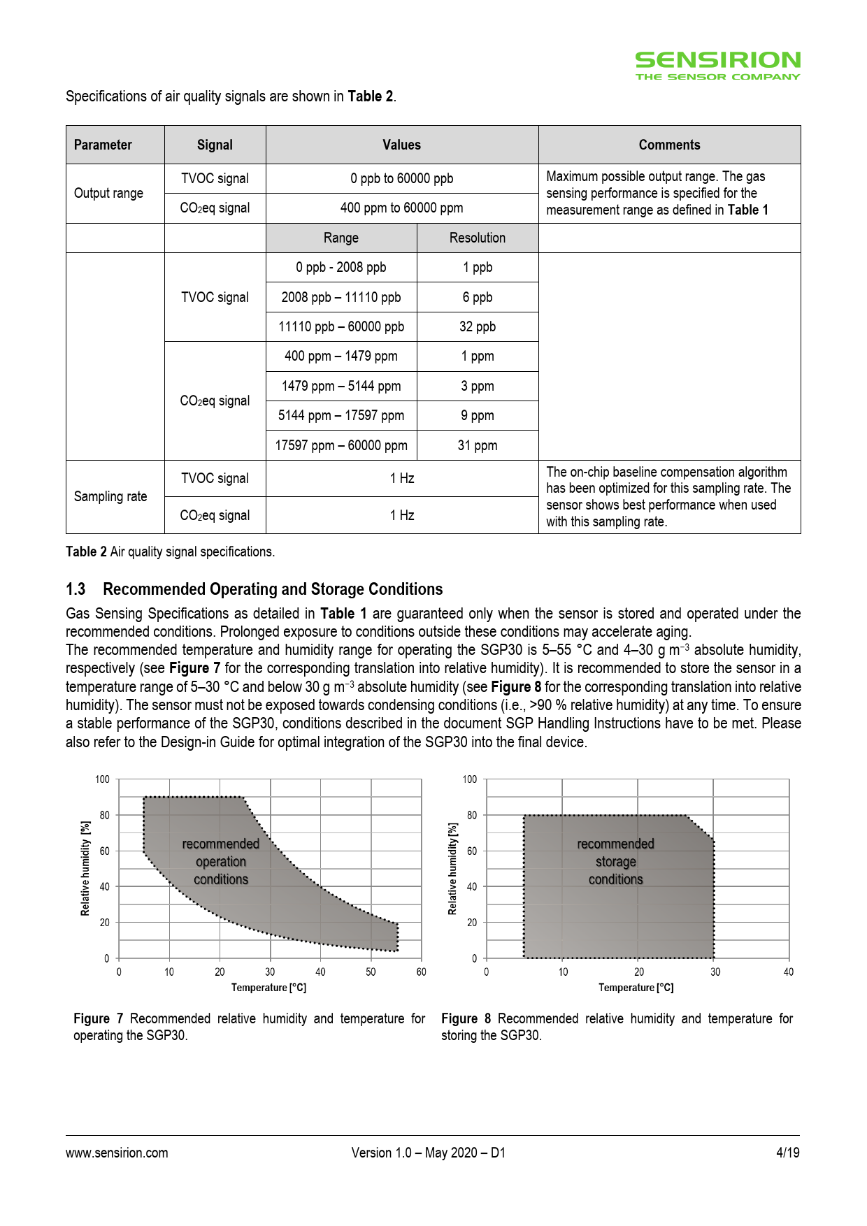 link to page 4 link to page 2 link to page 2 link to page 4 link to page 4 Specifications of air quality signals are shown in Table 2 . ParameterSignalValuesComments TVOC signal 0 ppb to 60000 ppb Maximum possible output range. The gas Output range sensing performance is specified for the CO2eq signal 400 ppm to 60000 ppm measurement range as defined in Table 1 Range Resolution 0 ppb - 2008 ppb 1 ppb TVOC signal 2008 ppb – 11110 ppb 6 ppb 11110 ppb – 60000 ppb 32 ppb 400 ppm – 1479 ppm 1 ppm 1479 ppm – 5144 ppm 3 ppm CO2eq signal 5144 ppm – 17597 ppm 9 ppm 17597 ppm – 60000 ppm 31 ppm TVOC signal 1 Hz The on-chip baseline compensation algorithm has been optimized for this sampling rate. The Sampling rate sensor shows best performance when used CO2eq signal 1 Hz with this sampling rate. Table 2 Air quality signal specifications. 1.3 Recommended Operating and Storage Conditions Gas Sensing Specifications as detailed in Table 1 are guaranteed only when the sensor is stored and operated under the recommended conditions. Prolonged exposure to conditions outside these conditions may accelerate aging. The recommended temperature and humidity range for operating the SGP30 is 5–55 °C and 4–30 g m−3 absolute humidity, respectively (see Figure 7 for the corresponding translation into relative humidity). It is recommended to store the sensor in a temperature range of 5–30 °C and below 30 g m−3 absolute humidity (see Figure 8 for the corresponding translation into relative humidity). The sensor must not be exposed towards condensing conditions (i.e., >90 % relative humidity) at any time. To ensure a stable performance of the SGP30, conditions described in the document SGP Handling Instructions have to be met. Please also refer to the Design-in Guide for optimal integration of the SGP30 into the final device. Figure 7 Recommended relative humidity and temperature for Figure 8 Recommended relative humidity and temperature for operating the SGP30. storing the SGP30. www.sensirion.com Version 1.0 – May 2020 – D1 4/19 Document Outline 1 Sensor Performance 1.1 Gas Sensing Performance 1.2 Air Quality Signals 1.3 Recommended Operating and Storage Conditions 2 Electrical Specifications 3 Interface Specifications The SGP30 comes in a 6-pin DFN package, see Table 4. 4 Absolute Minimum and Maximum Ratings 5 Timing Specifications 5.1 Sensor System Timings 5.2 Communication Timings 6 Operation and Communication 6.1 Power-Up and Communication Start 6.2 Measurement Communication Sequence 6.3 Measurement Commands 6.4 Soft Reset 6.5 Get Serial ID 6.6 Checksum Calculation 6.7 Communication Data Sequences 7 Quality 7.1 Environmental Stability 7.2 Material Contents 8 Device Package 8.1 Moisture Sensitivity Level 8.2 Traceability 8.3 Package Outline 8.4 Landing Pattern 8.5 Soldering Instructions 9 Tape & Reel Package 10 Ordering Information Revision History Important Notices Warning, Personal Injury ESD Precautions Warranty Headquarters and Subsidiaries