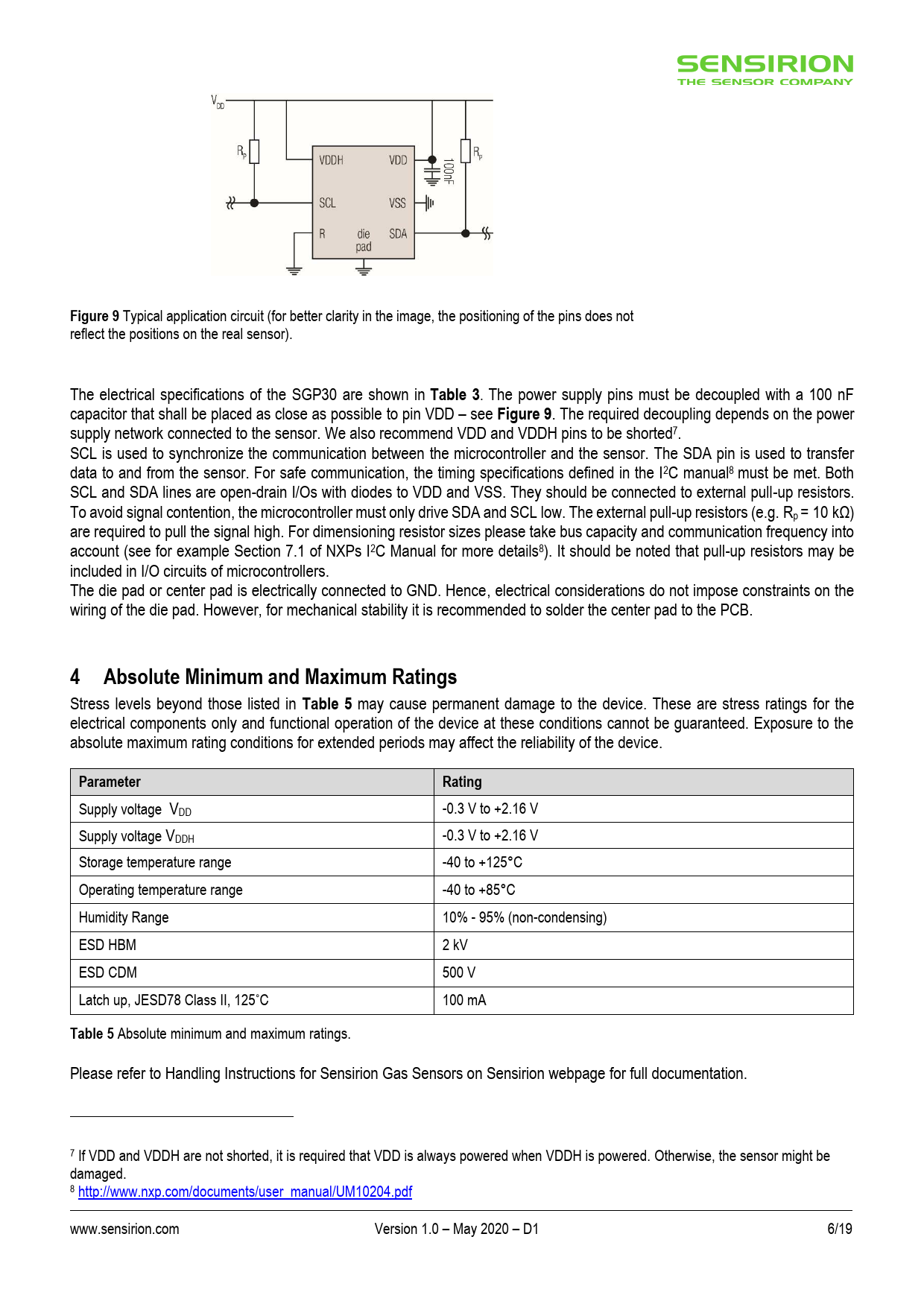 link to page 5 link to page 6 link to page 6 link to page 6 Figure 9 Typical application circuit (for better clarity in the image, the positioning of the pins does not reflect the positions on the real sensor). The electrical specifications of the SGP30 are shown in Table 3 . The power supply pins must be decoupled with a 100 nF capacitor that shall be placed as close as possible to pin VDD – see Figure 9 . The required decoupling depends on the power supply network connected to the sensor. We also recommend VDD and VDDH pins to be shorted7. SCL is used to synchronize the communication between the microcontroller and the sensor. The SDA pin is used to transfer data to and from the sensor. For safe communication, the timing specifications defined in the I2C manual8 must be met. Both SCL and SDA lines are open-drain I/Os with diodes to VDD and VSS. They should be connected to external pull-up resistors. To avoid signal contention, the microcontroller must only drive SDA and SCL low. The external pull-up resistors (e.g. Rp = 10 kΩ) are required to pull the signal high. For dimensioning resistor sizes please take bus capacity and communication frequency into account (see for example Section 7.1 of NXPs I2C Manual for more details8). It should be noted that pull-up resistors may be included in I/O circuits of microcontrollers. The die pad or center pad is electrically connected to GND. Hence, electrical considerations do not impose constraints on the wiring of the die pad. However, for mechanical stability it is recommended to solder the center pad to the PCB. 4 Absolute Minimum and Maximum Ratings Stress levels beyond those listed in Table 5 may cause permanent damage to the device. These are stress ratings for the electrical components only and functional operation of the device at these conditions cannot be guaranteed. Exposure to the absolute maximum rating conditions for extended periods may affect the reliability of the device. ParameterRating Supply voltage VDD -0.3 V to +2.16 V Supply voltage VDDH -0.3 V to +2.16 V Storage temperature range -40 to +125°C Operating temperature range -40 to +85°C Humidity Range 10% - 95% (non-condensing) ESD HBM 2 kV ESD CDM 500 V Latch up, JESD78 Class II, 125°C 100 mA Table 5 Absolute minimum and maximum ratings. Please refer to Handling Instructions for Sensirion Gas Sensors on Sensirion webpage for full documentation. 7 If VDD and VDDH are not shorted, it is required that VDD is always powered when VDDH is powered. Otherwise, the sensor might be damaged. 8 http://www.nxp.com/documents/user_manual/UM10204.pdf www.sensirion.com Version 1.0 – May 2020 – D1 6/19 Document Outline 1 Sensor Performance 1.1 Gas Sensing Performance 1.2 Air Quality Signals 1.3 Recommended Operating and Storage Conditions 2 Electrical Specifications 3 Interface Specifications The SGP30 comes in a 6-pin DFN package, see Table 4. 4 Absolute Minimum and Maximum Ratings 5 Timing Specifications 5.1 Sensor System Timings 5.2 Communication Timings 6 Operation and Communication 6.1 Power-Up and Communication Start 6.2 Measurement Communication Sequence 6.3 Measurement Commands 6.4 Soft Reset 6.5 Get Serial ID 6.6 Checksum Calculation 6.7 Communication Data Sequences 7 Quality 7.1 Environmental Stability 7.2 Material Contents 8 Device Package 8.1 Moisture Sensitivity Level 8.2 Traceability 8.3 Package Outline 8.4 Landing Pattern 8.5 Soldering Instructions 9 Tape & Reel Package 10 Ordering Information Revision History Important Notices Warning, Personal Injury ESD Precautions Warranty Headquarters and Subsidiaries