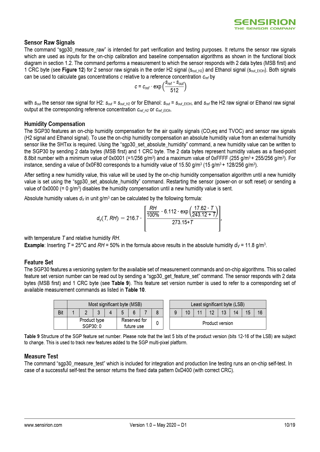 The SGP30 features a versioning system for the available set of measurement commands and on-chip algorithms. This so called feature set version number can be read out by sending a “sgp30_get_feature_set” command. The sensor responds with 2 data bytes (MSB first) and 1 CRC byte (see