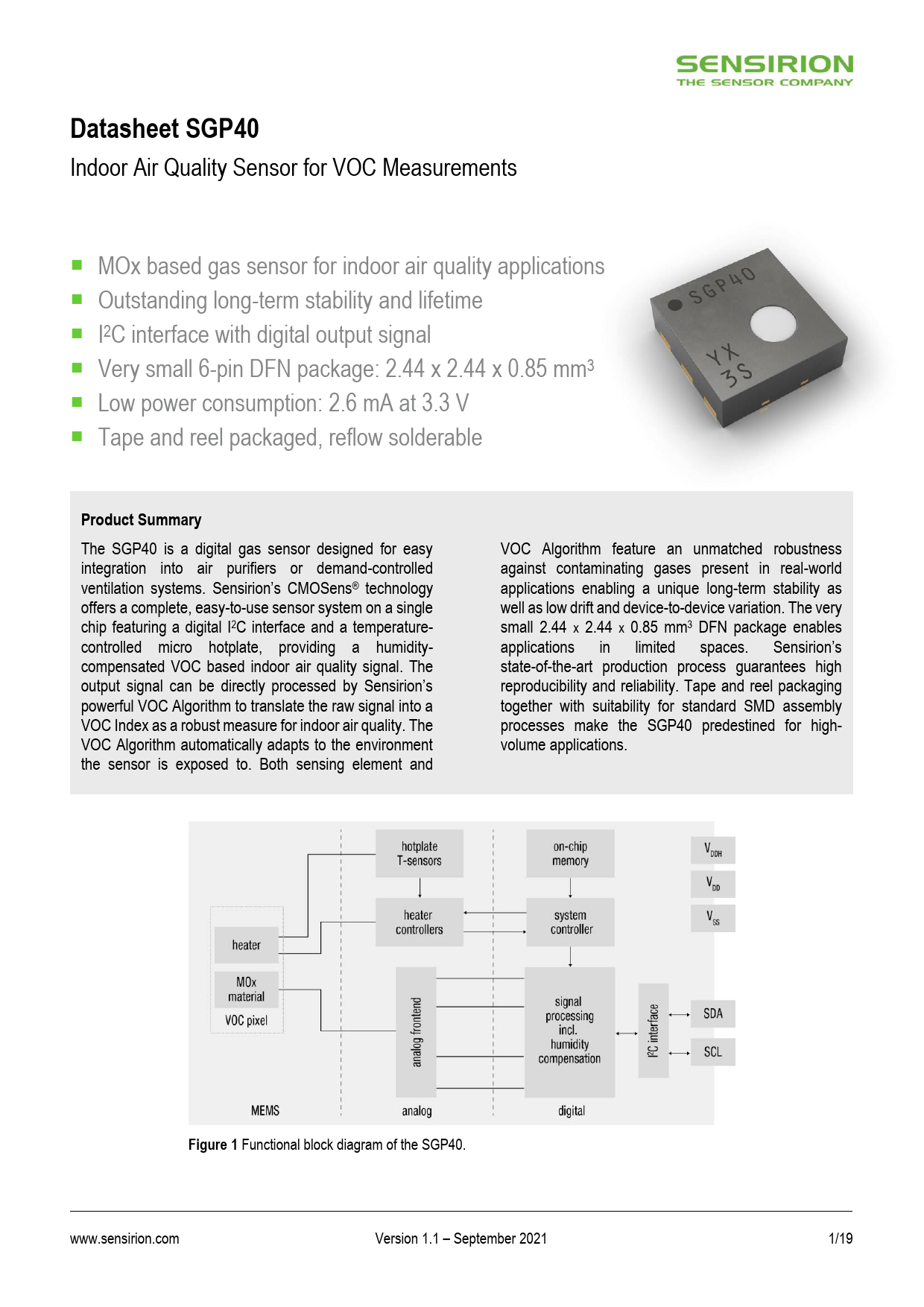 Datasheet SGP40 Indoor Air Quality Sensor for VOC Measurements MOx based gas sensor for indoor air quality applications Outstanding long-term stability and lifetime I2C interface with digital output signal Very small 6-pin DFN package: 2.44 x 2.44 x 0.85 mm3 Low power consumption: 2.6 mA at 3.3 V Tape and reel packaged, reflow solderable Product Summary The SGP40 is a digital gas sensor designed for easy VOC Algorithm feature an unmatched robustness integration into air purifiers or demand-controlled against contaminating gases present in real-world ventilation systems. Sensirion’s CMOSens® technology applications enabling a unique long-term stability as offers a complete, easy-to-use sensor system on a single well as low drift and device-to-device variation. The very chip featuring a digital I2C interface and a temperature- small 2.44 x 2.44 x 0.85 mm3 DFN package enables controlled micro hotplate, providing a humidity- applications in limited spaces. Sensirion’s compensated VOC based indoor air quality signal. The state-of-the-art production process guarantees high output signal can be directly processed by Sensirion’s reproducibility and reliability. Tape and reel packaging powerful VOC Algorithm to translate the raw signal into a together with suitability for standard SMD assembly VOC Index as a robust measure for indoor air quality. The processes make the SGP40 predestined for high- VOC Algorithm automatically adapts to the environment volume applications. the sensor is exposed to. Both sensing element and Figure 1 Functional block diagram of the SGP40. www.sensirion.com Version 1.1 – September 2021 1/19