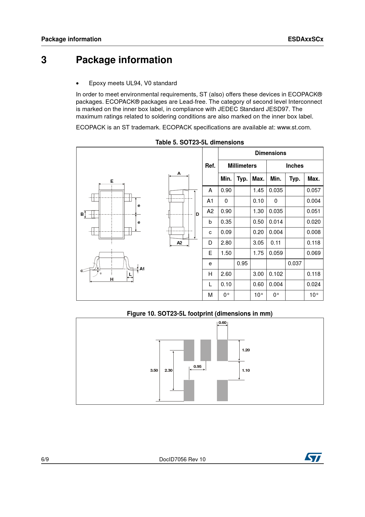 Package informationESDAxxSCx3 Packageinformation • Epoxy meets UL94, V0 standard In order to meet environmental requirements, ST (also) offers these devices in ECOPACK® packages. ECOPACK® packages are Lead-free. The category of second level Interconnect is marked on the inner box label, in compliance with JEDEC Standard JESD97. The maximum ratings related to soldering conditions are also marked on the inner box label. ECOPACK is an ST trademark. ECOPACK specifications are available at: www.st.com. Table 5. SOT23-5L dimensionsDimensionsRef.MillimetersInchesAMin.Typ. Max.Min.Typ.Max.E A 0.90 1.45 0.035 0.057 A1 0 0.10 0 0.004 e A2 0.90 1.30 0.035 0.051 BDe b 0.35 0.50 0.014 0.020 c 0.09 0.20 0.004 0.008 A2 D 2.80 3.05 0.11 0.118 E 1.50 1.75 0.059 0.069 e 0.95 0.037 cA1 θ L H 2.60 3.00 0.102 0.118 H L 0.10 0.60 0.004 0.024 M 0° 10° 0° 10° Figure 10. SOT23-5L footprint (dimensions in mm)0.601.200.953.502.301.10 6/9 DocID7056 Rev 10 Document Outline Figure 1. ESDAxxSC5 functional diagram Figure 2. ESDAxxSC6 functional diagram Table 1. Device summary 1 Characteristics Table 2. Absolute ratings (Tamb = 25 °C) Table 3. Electrical characteristics - definitions (Tamb = 25 °C) Table 4. Electrical characteristics - values (Tamb = 25 °C) Figure 3. Peak power dissipation versus initial junction temperature Figure 4. Peak pulse power versus exponential pulse duration (Tj initial = 25 °C) Figure 5. Clamping voltage versus peak pulse current (Tj initial = 25 °C). Rectangular waveform tp = 2.5 µs Figure 6. Capacitance versus reverse applied voltage Figure 7. Relative variation of leakage current versus junction temperature Figure 8. Peak forward voltage drop versus peak forward current 2 Ordering information Figure 9. Ordering information scheme 3 Package information Table 5. SOT23-5L dimensions Figure 10. SOT23-5L footprint (dimensions in mm) Table 6. SOT23-6L dimensions Figure 11. SOT23-6L footprint (dimensions in mm) 4 Ordering information Table 7. Ordering information 5 Revision history Table 8. Document revision history