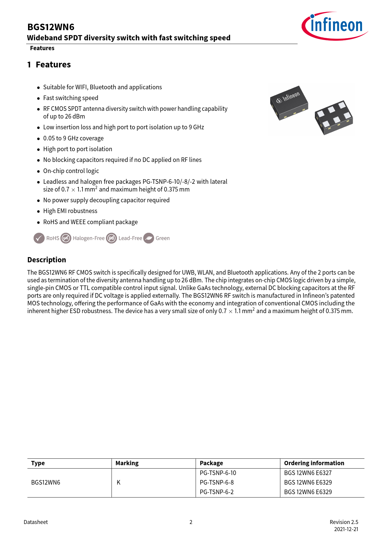 • Suitable for WIFI, Bluetooth and applications • Fast switching speed • RF CMOS SPDT antenna diversity switch with power handling capability of up to 26 dBm • Low insertion loss and high port to port isolation up to 9 GHz • 0.05 to 9 GHz coverage • High port to port isolation • No blocking capacitors required if no DC applied on RF lines • On-chip control logic • Leadless and halogen free packages PG-TSNP-6-10/-8/-2 with lateral size of 0.7 × 1.1 mm2 and maximum height of 0.375 mm • No power supply decoupling capacitor required • High EMI robustness • RoHS and WEEE compliant package