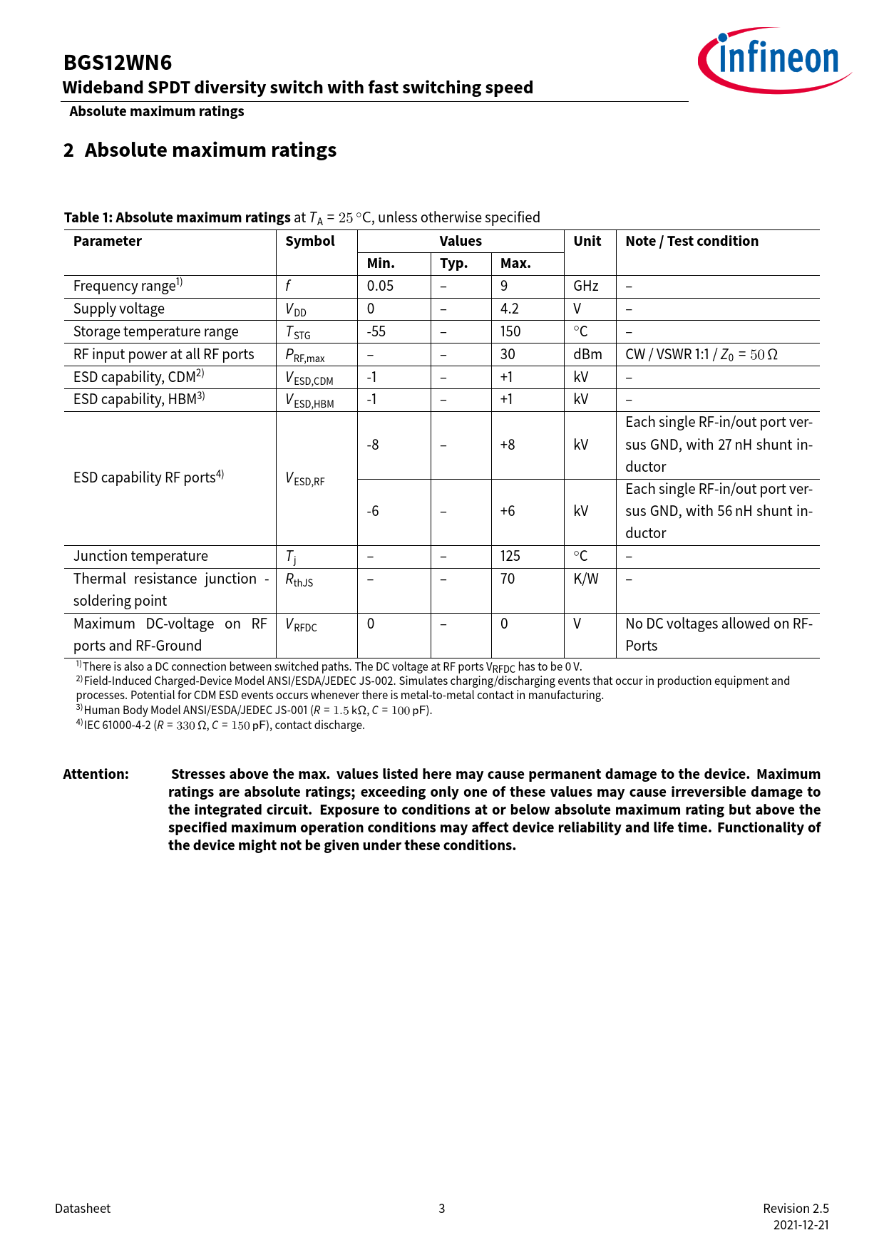 BGS12WN6 Wideband SPDT diversity switch with fast switching speed Absolute maximum ratings 2 Absolute maximum ratings