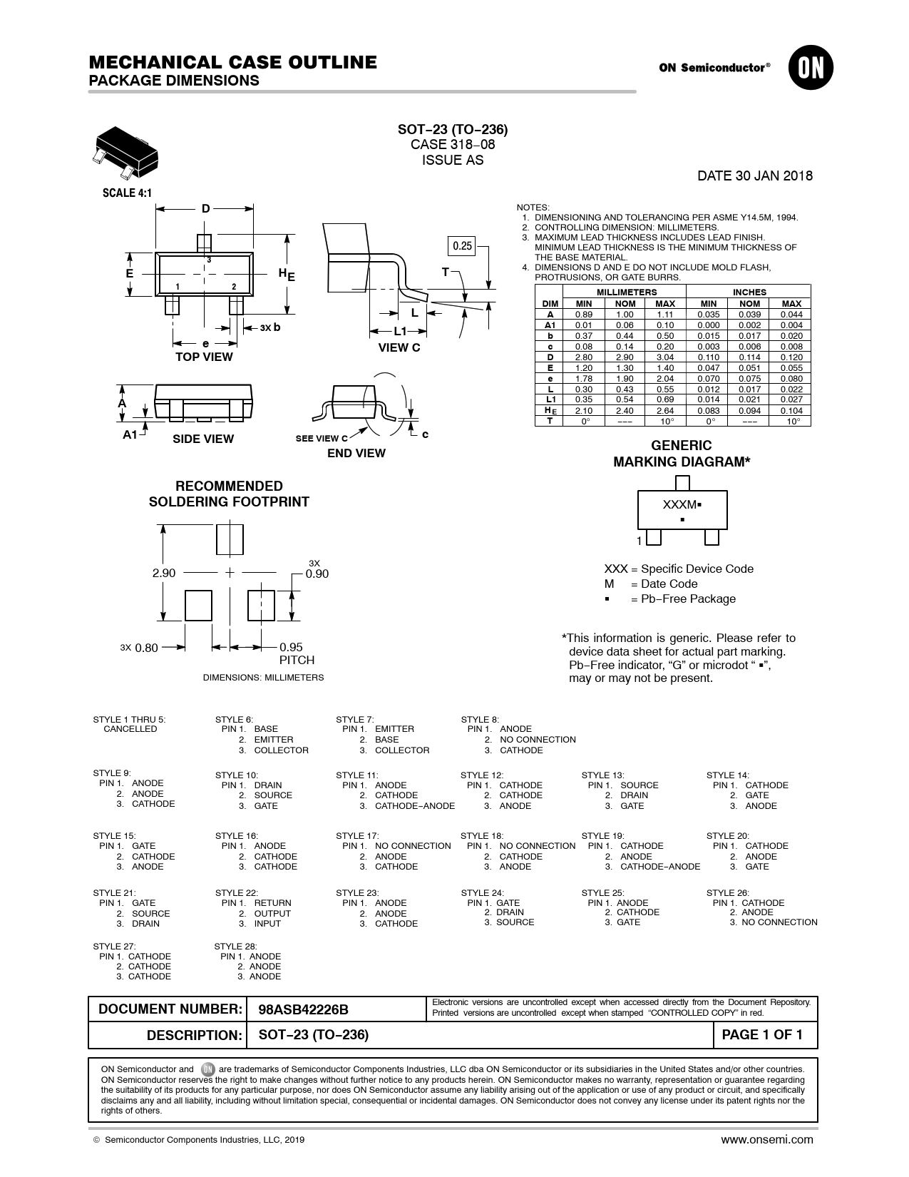 XXXMG G 1 3X XXX = Specific Device Code 2.90 0.90 M = Date Code G = Pb−Free Package *This information is generic. Please refer to 3X 0.80 0.95 device data sheet for actual part marking. PITCH Pb−Free indicator, “G” or microdot “ G”, DIMENSIONS: MILLIMETERS may or may not be present. STYLE 1 THRU 5: STYLE 6: STYLE 7: STYLE 8: CANCELLED PIN 1. BASE PIN 1. EMITTER PIN 1. ANODE 2. EMITTER 2. BASE 2. NO CONNECTION 3. COLLECTOR 3. COLLECTOR 3. CATHODE STYLE 9: STYLE 10: STYLE 11: STYLE 12: STYLE 13: STYLE 14: PIN 1. ANODE PIN 1. DRAIN PIN 1. ANODE PIN 1. CATHODE PIN 1. SOURCE PIN 1. CATHODE 2. ANODE 2. SOURCE 2. CATHODE 2. CATHODE 2. DRAIN 2. GATE 3. CATHODE 3. GATE 3. CATHODE−ANODE 3. ANODE 3. GATE 3. ANODE STYLE 15: STYLE 16: STYLE 17: STYLE 18: STYLE 19: STYLE 20: PIN 1. GATE PIN 1. ANODE PIN 1. NO CONNECTION PIN 1. NO CONNECTION PIN 1. CATHODE PIN 1. CATHODE 2. CATHODE 2. CATHODE 2. ANODE 2. CATHODE 2. ANODE 2. ANODE 3. ANODE 3. CATHODE 3. CATHODE 3. ANODE 3. CATHODE−ANODE 3. GATE STYLE 21: STYLE 22: STYLE 23: STYLE 24: STYLE 25: STYLE 26: PIN 1. GATE PIN 1. RETURN PIN 1. ANODE PIN 1. GATE PIN 1. ANODE PIN 1. CATHODE 2. SOURCE 2. OUTPUT 2. ANODE 2. DRAIN 2. CATHODE 2. ANODE 3. DRAIN 3. INPUT 3. CATHODE 3. SOURCE 3. GATE 3. NO CONNECTION STYLE 27: STYLE 28: PIN 1. CATHODE PIN 1. ANODE 2. CATHODE 2. ANODE 3. CATHODE 3. ANODE