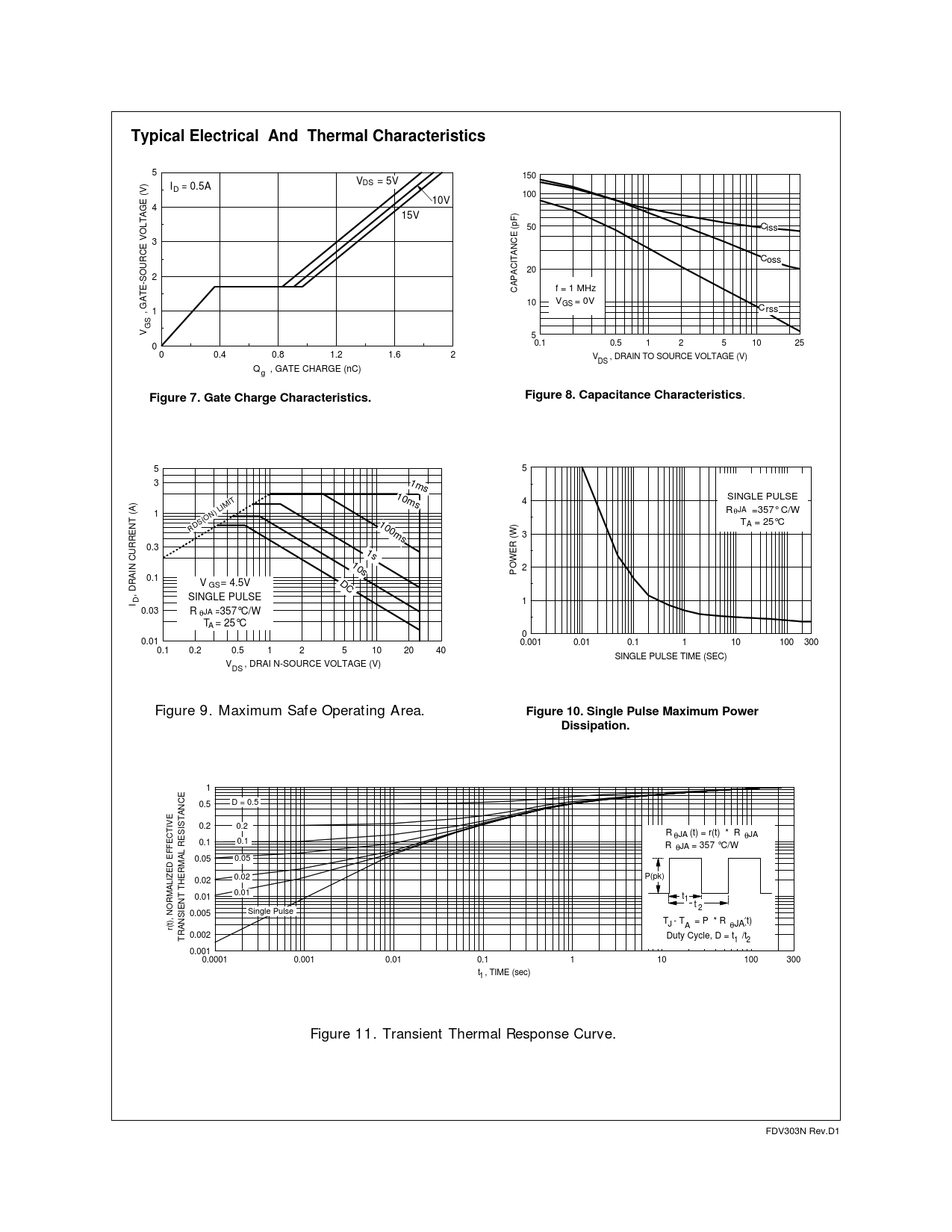 Typical Electrical And Thermal Characteristics 5 150 V = 5V I = 0.5A DS D 100 10V 4 15V 50 C iss 3 C oss 20 2 CAPACITANCE (pF) f = 1 MHz 10 V = 0V GS C 1 rss GS V , GATE-SOURCE VOLTAGE (V) 5 0 0.1 0.5 1 2 5 10 25 0 0.4 0.8 1.2 1.6 2 V , DRAIN TO SOURCE VOLTAGE (V) DS Q , GATE CHARGE (nC) g Figure 8. Capacitance Characteristics . Figure 7. Gate Charge Characteristics. 5 5 3 1ms 10ms SINGLE PULSE 4 1 R =357° C/W θJA 100ms T = 25°C A RDS(ON) LIMIT 3 0.3 1s 10s 2 POWER (W) 0.1 V = 4.5V DC GS SINGLE PULSE I , DRAIN CURRENT (A) D 1 0.03 R =357°C/W θJA T = 25°C A 0 0.01 0.001 0.01 0.1 1 10 100 300 0.1 0.2 0.5 1 2 5 10 20 40 SINGLE PULSE TIME (SEC) V , DRAI N-SOURCE VOLTAGE (V) DS Figure 9. Maximum Safe Operating Area.Figure 10. Single Pulse Maximum PowerDissipation. 1 0.5 D = 0.5 0.2 0.2 R (t) = r(t) * R θJA θJA 0.1 0.1 R = 357 °C/W θJA 0.05 0.05 0.02 P(pk) 0.02 0.01 0.01 t 1 t 2 0.005 Single Pulse T - T = P * R (t) J A θJA r(t), NORMALIZED EFFECTIVE 0.002 TRANSIENT THERMAL RESISTANCE Duty Cycle, D = t /t 1 2 0.001 0.0001 0.001 0.01 0.1 1 10 100 300 t , TIME (sec) 1 Figure 11. Transient Thermal Response Curve . FDV303N Rev.D1