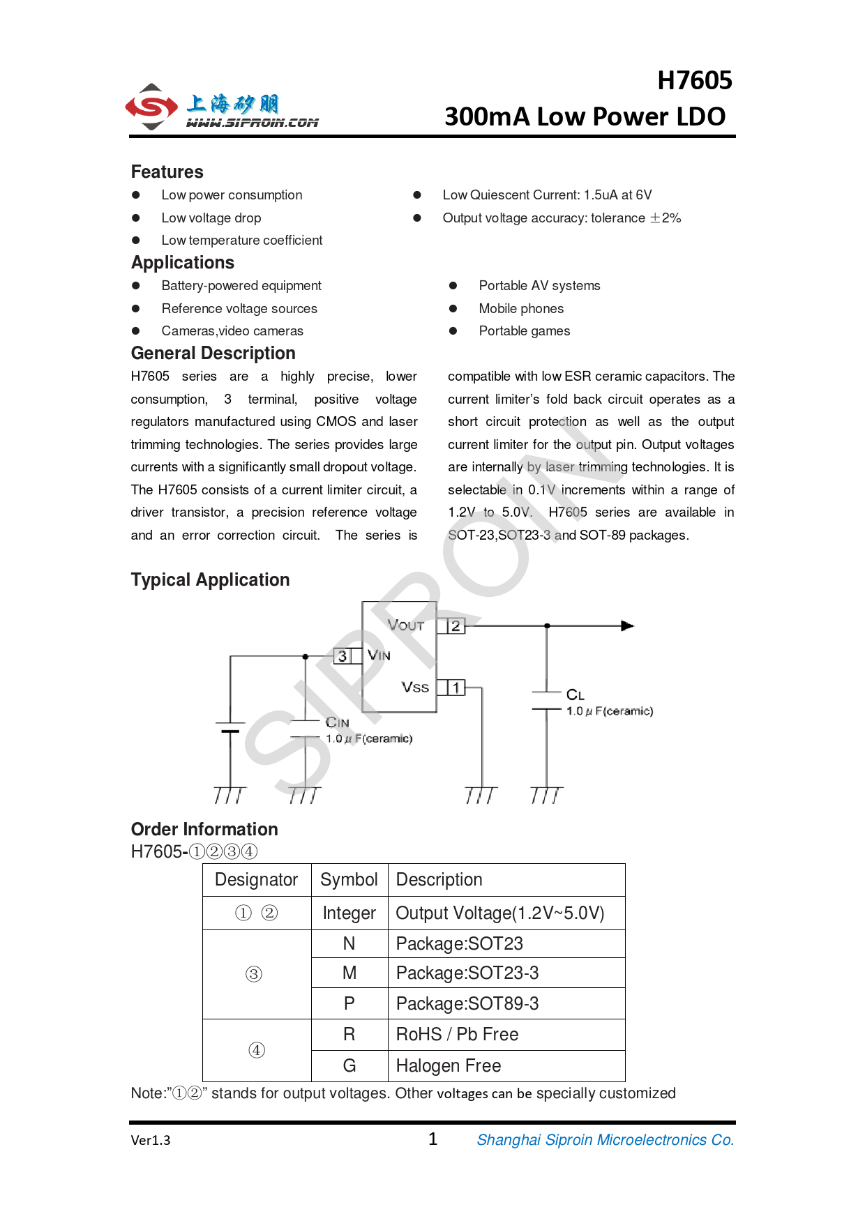 H7605300mA Low Power LDOFeatures Low power consumption Low Quiescent Current: 1.5uA at 6V Low voltage drop Output voltage accuracy: tolerance ±2% Low temperature coefficient Applications Battery-powered equipment Portable AV systems Reference voltage sources Mobile phones Cameras,video cameras Portable games General Description H7605 series are a highly precise, lower compatible with low ESR ceramic capacitors. The consumption, 3 terminal, positive voltage current limiter’s fold back circuit operates as a regulators manufactured using CMOS and laser short circuit protection as well as the output trimming technologies. The series provides large current limiter for the output pin. Output voltages currents with a significantly small dropout voltage. are internally by laser trimming technologies. It is The H7605 consists of a current limiter circuit, a selectable in 0.1V increments within a range of driver transistor, a precision reference voltage 1.2V to 5.0V. H7605 series are available in and an error correction circuit. The series is SOT-23,SOT23-3 and SOT-89 packages. Typical Application SIPROIN Order Information H7605 - ①②③④ Designator Symbol Description ① ② Integer Output Voltage(1.2V~5.0V) N Package:SOT23 ③ M Package:SOT23-3 P Package:SOT89-3 R RoHS / Pb Free ④ G Halogen Free Note:”①②” stands for output voltages. Other voltages can be specially customized Ver1.3 1 Shanghai Siproin Microelectronics Co.