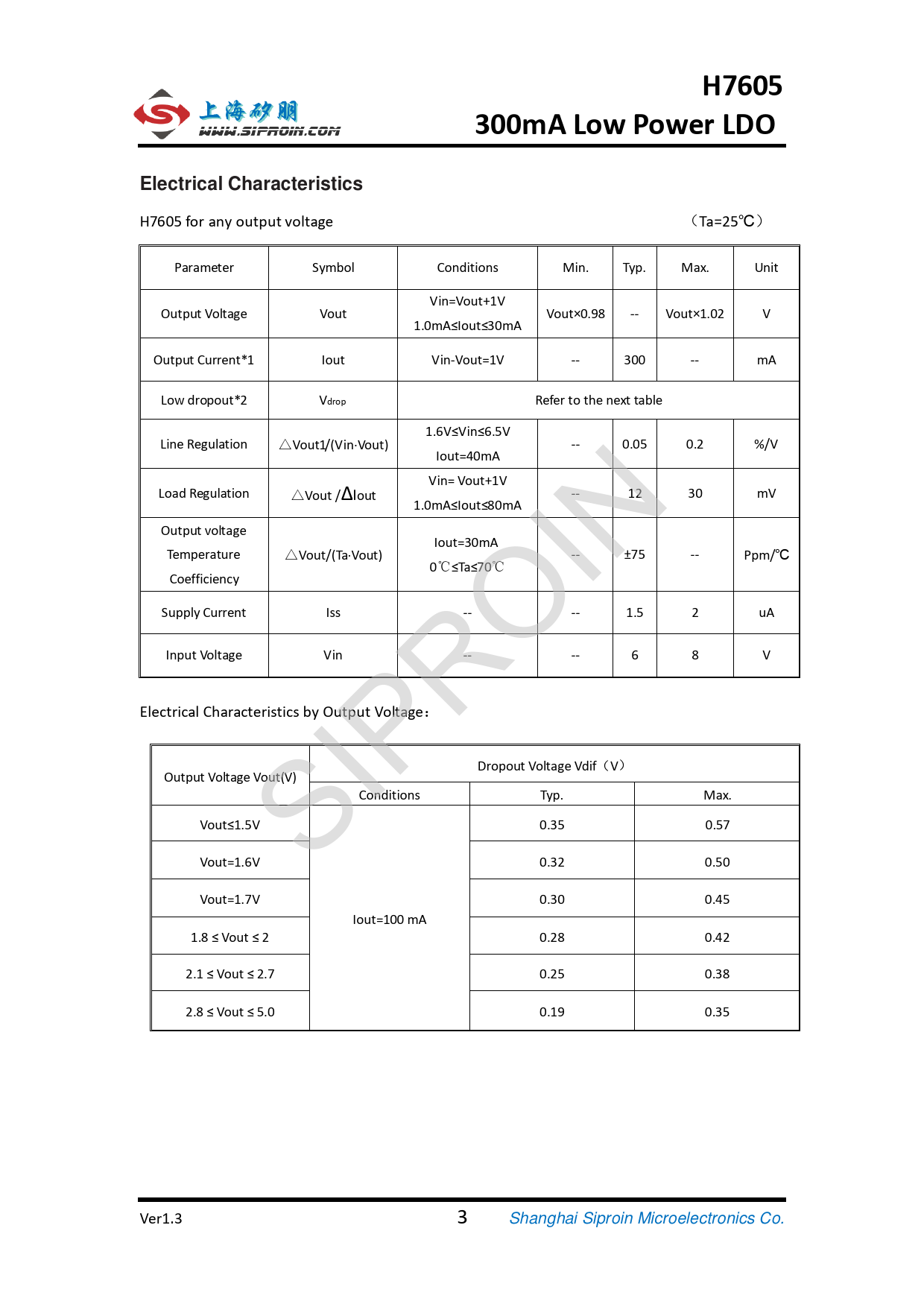 H7605. 300mA Low Power LDO. Electrical Characteristics