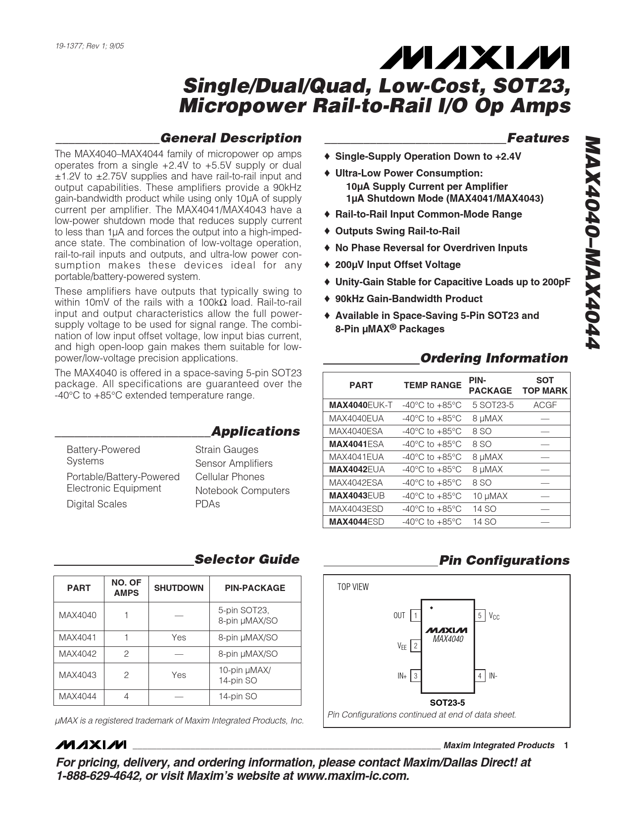 Single/Dual/Quad, Low-Cost, SOT23,. Micropower Rail-to-Rail I/O Op Amps. MAX4040–MAX4044. ________________General Description