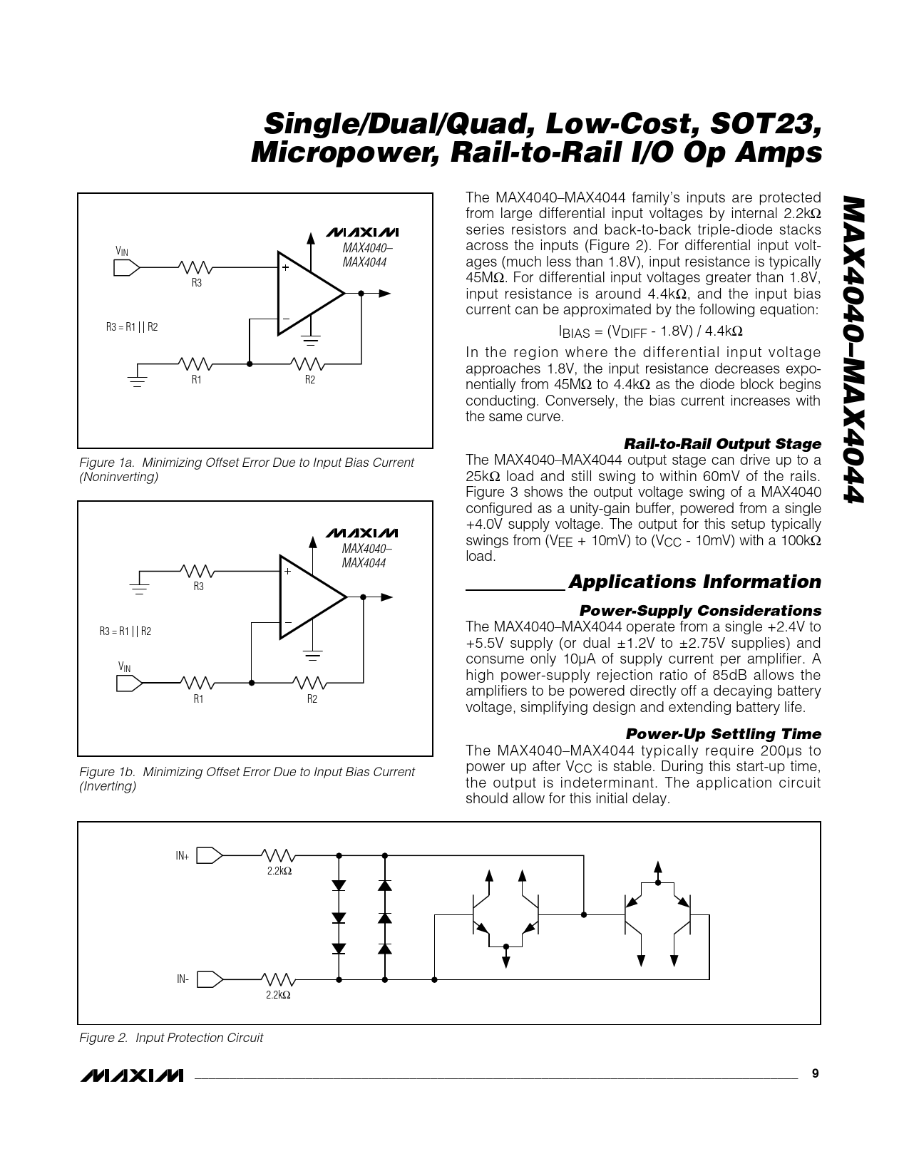 Single/Dual/Quad, Low-Cost, SOT23,Micropower, Rail-to-Rail I/O Op AmpsMAX4040–MAX4044 The MAX4040–MAX4044 family’s inputs are protected from large differential input voltages by internal 2.2kΩ series resistors and back-to-back triple-diode stacks MAX4040– across the inputs (Figure 2). For differential input volt- VIN MAX4044 ages (much less than 1.8V), input resistance is typically 45M R3 Ω. For differential input voltages greater than 1.8V, input resistance is around 4.4kΩ, and the input bias current can be approximated by the following equation: R3 = R1 R2 IBIAS = (VDIFF - 1.8V) / 4.4kΩ In the region where the differential input voltage approaches 1.8V, the input resistance decreases expo- R1 R2 nentially from 45MΩ to 4.4kΩ as the diode block begins conducting. Conversely, the bias current increases with the same curve. Rail-to-Rail Output Stage Figure 1a. Minimizing Offset Error Due to Input Bias Current The MAX4040–MAX4044 output stage can drive up to a (Noninverting) 25kΩ load and still swing to within 60mV of the rails. Figure 3 shows the output voltage swing of a MAX4040 configured as a unity-gain buffer, powered from a single +4.0V supply voltage. The output for this setup typically swings from (VEE + 10mV) to (VCC - 10mV) with a 100kΩ MAX4040– load. MAX4044 R3 Applications InformationPower-Supply Considerations The MAX4040–MAX4044 operate from a single +2.4V to R3 = R1 R2 +5.5V supply (or dual ±1.2V to ±2.75V supplies) and consume only 10µA of supply current per amplifier. A VIN high power-supply rejection ratio of 85dB allows the amplifiers to be powered directly off a decaying battery R1 R2 voltage, simplifying design and extending battery life. Power-Up Settling Time The MAX4040–MAX4044 typically require 200µs to power up after VCC is stable. During this start-up time, Figure 1b. Minimizing Offset Error Due to Input Bias Current the output is indeterminant. The application circuit (Inverting) should allow for this initial delay. IN+ 2.2kΩ IN- 2.2kΩ Figure 2. Input Protection Circuit _______________________________________________________________________________________9