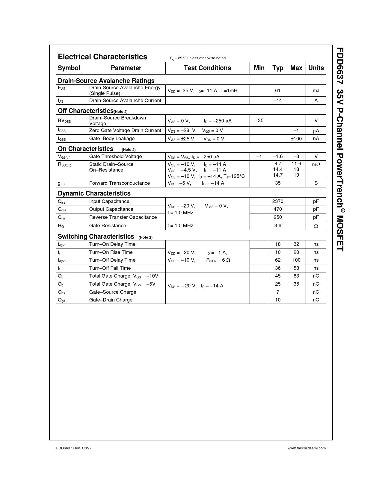 td(on) Turn–On Delay Time 18 32 ns tr Turn–On Rise Time V 10 20 ns DD = –20 V, ID = –1 A, td(off) Turn–Off Delay Time VGS = –10 V, RGEN = 6 Ω 62 100 ns tf Turn–Off Fall Time 36 58 ns Qg Total Gate Charge, VGS = –10V 45 63 nC Qg Total Gate Charge, VGS = –5V 25 35 nC VDS = – 20 V, ID = –14 A Q gs Gate–Source Charge 7 nC Qgd Gate–Drain Charge 10 nC FDD6637 Rev. C(W) www.fairchildsemi.com