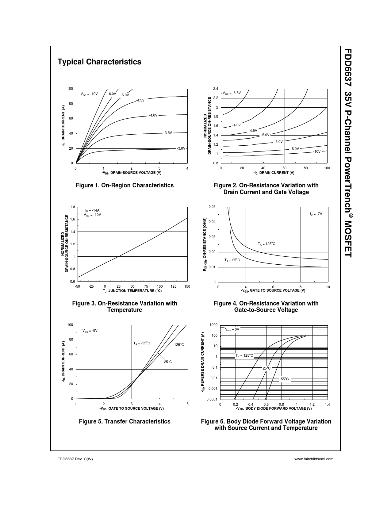 FDDTypical Characteristics6637 100 2.4 35 V -6.0V VGS = -3.5V GS = -10V -5.0V E 2.2 -4.5V V P-C 80 N)AA 2 TT (IS SDEN -4.0V E 1.8 C 60 E IZ-R NhURRALO 1.6 -4.0V aN CRM -4.5V 40 -3.5V RCEnn 1.4 -5.0V RAINOU, DSO -6.0V D-IN- 1.2 e 20 -3.0V AI -8.0V l P -10V DR 1 o 0 0.8 w 0 1 2 3 4 0 20 40 60 80 100 -VeDS, DRAIN-SOURCE VOLTAGE (V)-ID, DRAIN CURRENT (A)rTrFigure 1. On-Region CharacteristicsFigure 2. On-Resistance Variation withDrain Current and Gate Voltagee n c h 1.8 0.05 ID = -14A ® V I GS = -10V D = -7A M 1.6 NCEM) 0.04 TAOSIS(OHS 1.4 EDEC N-R 0.03 IZEFETNTAAL 1.2 IS T E OS A = 125oC RMEO-R 0.02 NURCNO 1 -S, O ) T NN A = 25oC (ORAIDS 0.01 0.8 RD 0.6 0 -50 -25 0 25 50 75 100 125 150 2 4 6 8 10 oTJ, JUNCTION TEMPERATURE ( C)-VGS, GATE TO SOURCE VOLTAGE (V)Figure 3. On-Resistance Variation withFigure 4. On-Resistance Variation withTemperatureGate-to-Source Voltage 100 1000 V VGS = 0V DS = -5V 100 80 T (A)) TA = -55oC EN(A 125oC 10 RRENT 60 CU 1 TA = 125oC URR 25oC AINN C 0.1 40 25oC RAISE DR, D 0.01 D -55oC -I 20 , REVER S 0.001 -I 0 0.0001 1 2 3 4 5 0 0.2 0.4 0.6 0.8 1 1.2 1.4 -VGS, GATE TO SOURCE VOLTAGE (V)-VSD, BODY DIODE FORWARD VOLTAGE (V)Figure 5. Transfer CharacteristicsFigure 6. Body Diode Forward Voltage Variationwith Source Current and Temperature FDD6637 Rev. C(W) www.fairchildsemi.com