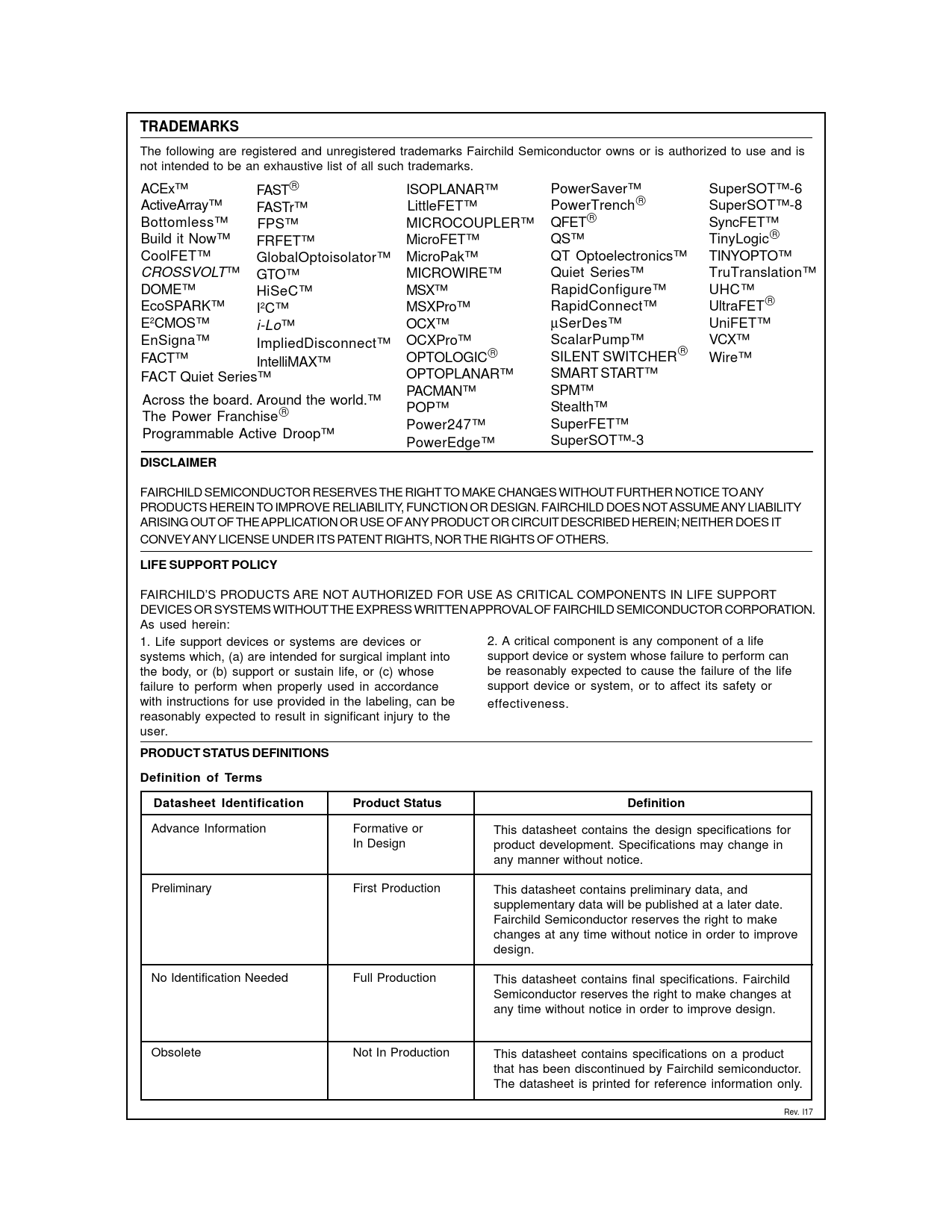 Advance Information Formative or This datasheet contains the design specifications for In Design product development. Specifications may change in any manner without notice. Preliminary First Production This datasheet contains preliminary data, and supplementary data will be published at a later date. Fairchild Semiconductor reserves the right to make changes at any time without notice in order to improve design. No Identification Needed Full Production This datasheet contains final specifications. Fairchild Semiconductor reserves the right to make changes at any time without notice in order to improve design. Obsolete Not In Production This datasheet contains specifications on a product that has been discontinued by Fairchild semiconductor. The datasheet is printed for reference information only. Rev. I17