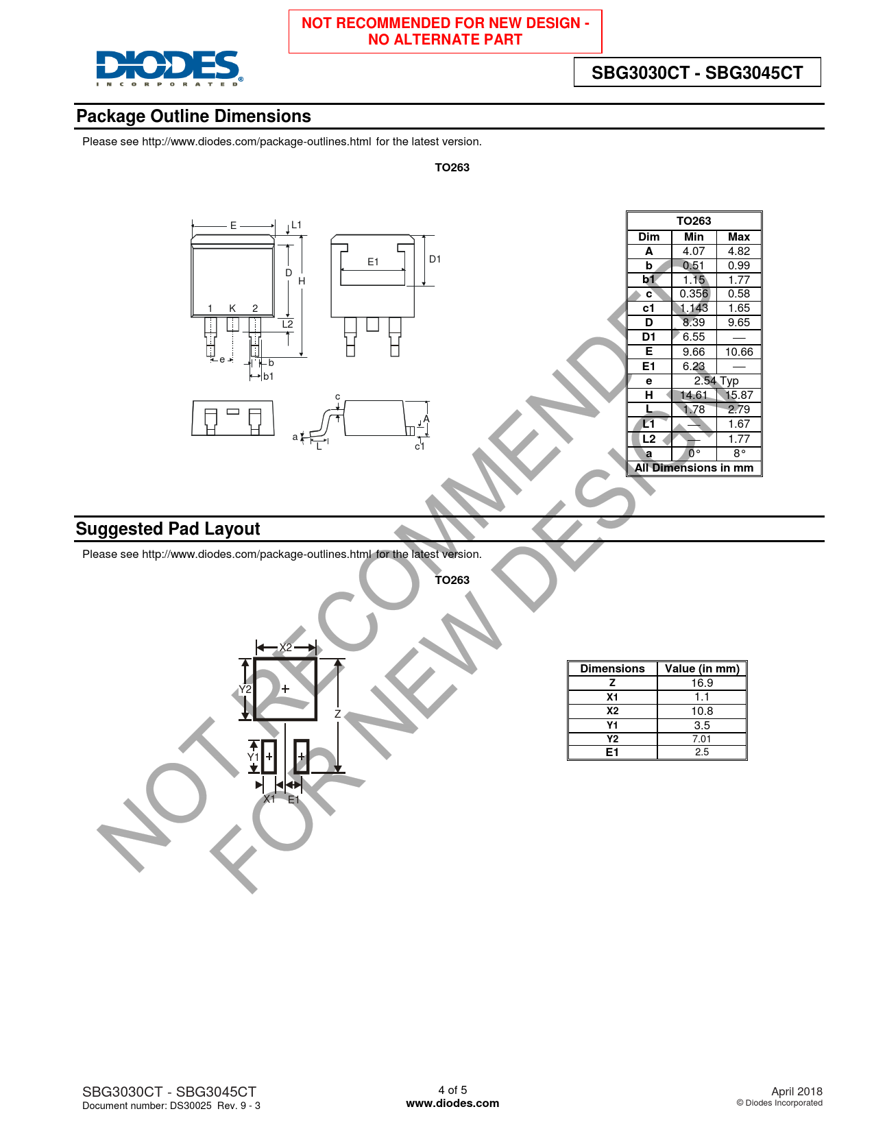 NOT RECOMMENDED FOR NEW DESIGN -. NO ALTERNATE PART. SBG3030CT - SBG3045CT. Package Outline Dimensions. TO263. Dim. Min. Max