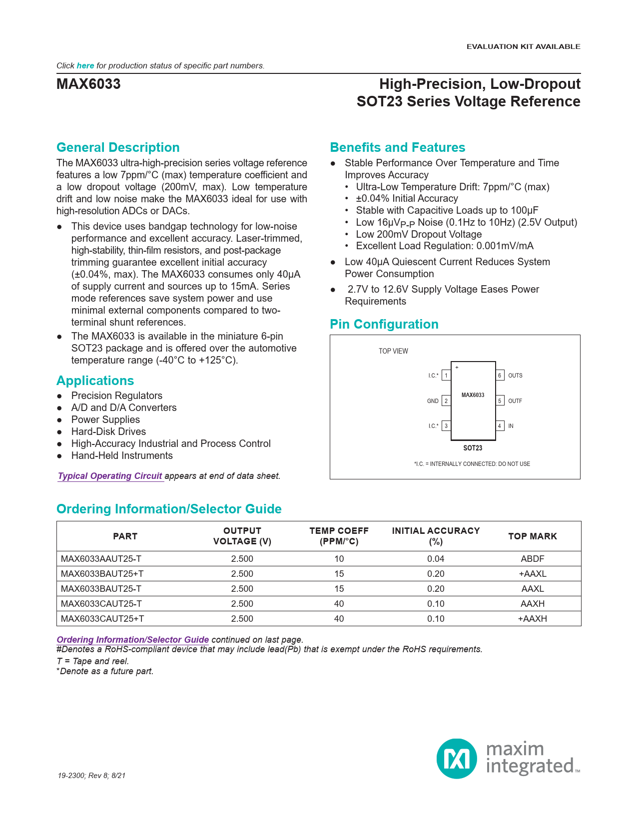 link to page 12 link to page 11 EVALUATION KIT AVAILABLE Click here for production status of specific part numbers. MAX6033High-Precision, Low-DropoutSOT23 Series Voltage ReferenceGeneral DescriptionBenefits and Features The MAX6033 ultra-high-precision series voltage reference ● Stable Performance Over Temperature and Time features a low 7ppm/°C (max) temperature coefficient and Improves Accuracy a low dropout voltage (200mV, max). Low temperature • Ultra-Low Temperature Drift: 7ppm/°C (max) drift and low noise make the MAX6033 ideal for use with • ±0.04% Initial Accuracy high-resolution ADCs or DACs. • Stable with Capacitive Loads up to 100µF ● This device uses bandgap technology for low-noise • Low 16μVP-P Noise (0.1Hz to 10Hz) (2.5V Output) performance and excellent accuracy. Laser-trimmed, • Low 200mV Dropout Voltage high-stability, thin-film resistors, and post-package • Excellent Load Regulation: 0.001mV/mA trimming guarantee excellent initial accuracy ● Low 40μA Quiescent Current Reduces System (±0.04%, max). The MAX6033 consumes only 40µA Power Consumption of supply current and sources up to 15mA. Series ● 2.7V to 12.6V Supply Voltage Eases Power mode references save system power and use Requirements minimal external components compared to two- terminal shunt references. Pin Configuration ● The MAX6033 is available in the miniature 6-pin SOT23 package and is offered over the automotive TOP VIEW temperature range (-40°C to +125°C). + Applications I.C.* 1 6 OUTS ● Precision Regulators MAX6033 GND 2 5 OUTF ● A/D and D/A Converters ● Power Supplies ● Hard-Disk Drives I.C.* 3 4 IN ● High-Accuracy Industrial and Process Control SOT23 ● Hand-Held Instruments *I.C. = INTERNALLY CONNECTED: DO NOT USE Typical Operating Circuit appears at end of data sheet. Ordering Information/Selector GuidePARTOUTPUTTEMP COEFFINITIAL ACCURACYVOLTAGE (V)(PPM/°C)(%)TOP MARK MAX6033AAUT25-T 2.500 10 0.04 ABDF MAX6033BAUT25+T 2.500 15 0.20 +AAXL MAX6033BAUT25-T 2.500 15 0.20 AAXL MAX6033CAUT25-T 2.500 40 0.10 AAXH MAX6033CAUT25+T 2.500 40 0.10 +AAXH Ordering Information/Selector Guide continued on last page. #Denotes a RoHS-compliant device that may include lead(Pb) that is exempt under the RoHS requirements. T = Tape and reel. *Denote as a future part. 19-2300; Rev 8; 8/21 Document Outline _GoBack