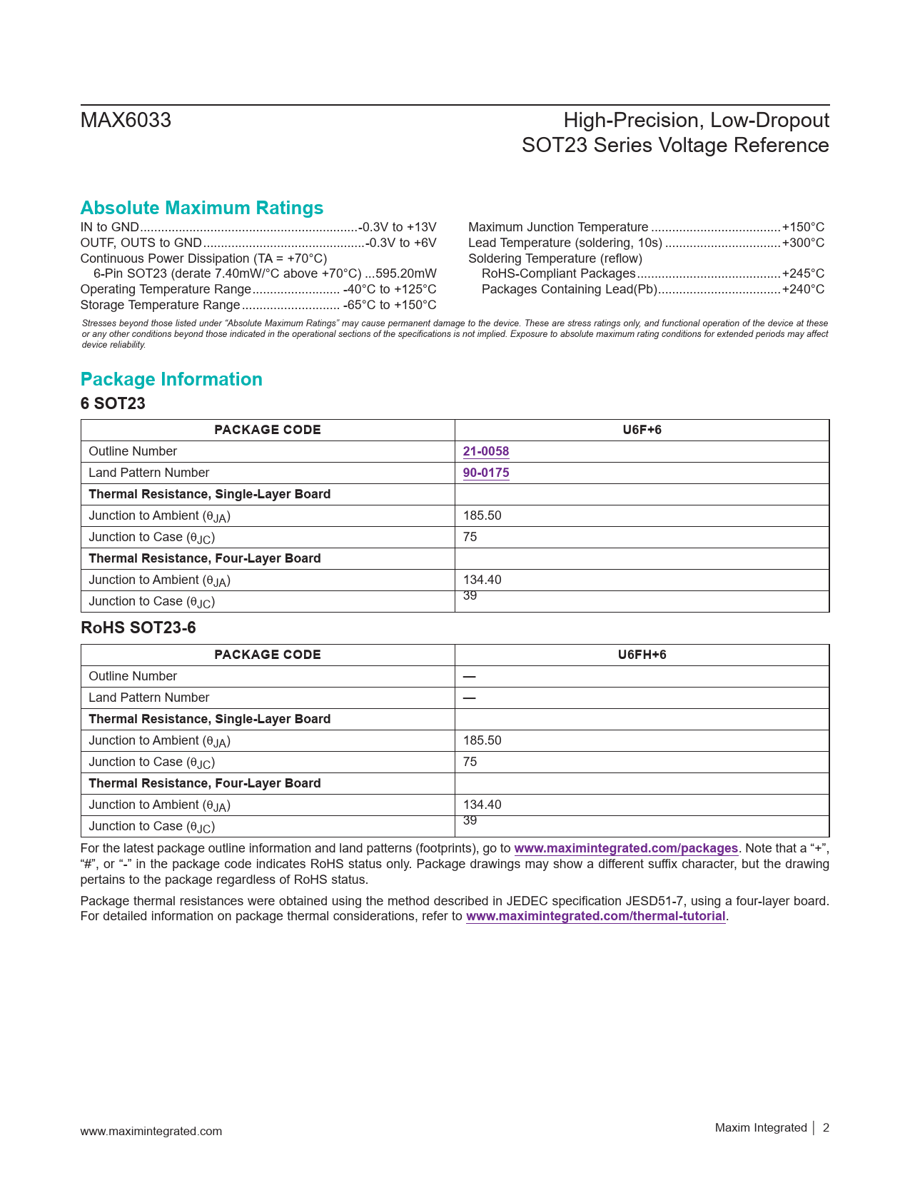 Absolute Maximum Ratings. Package Information. 6 SOT23. PACKAGE CODE. U6F+6. 21-0058. 90-0175. Thermal Resistance, Single-Layer Board