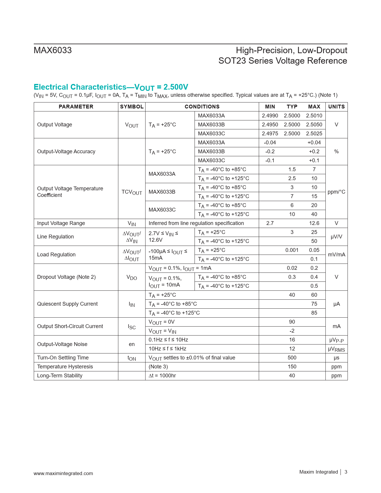 MAX6033 High-Precision, Low-Dropout SOT23 Series Voltage Reference Electrical Characteristics—VOUT = 2.500V (VIN = 5V, COUT = 0.1µF, IOUT = 0A, TA = TMIN to TMAX, unless otherwise specified. Typical values are at TA = +25°C.) (Note 1) PARAMETERSYMBOLCONDITIONSMINTYPMAXUNITS MAX6033A 2.4990 2.5000 2.5010 Output Voltage VOUT TA = +25°C MAX6033B 2.4950 2.5000 2.5050 V MAX6033C 2.4975 2.5000 2.5025 MAX6033A -0.04 +0.04 Output-Voltage Accuracy TA = +25°C MAX6033B -0.2 +0.2 % MAX6033C -0.1 +0.1 T MAX6033A A = -40°C to +85°C 1.5 7 TA = -40°C to +125°C 2.5 10 Output Voltage Temperature TA = -40°C to +85°C 3 10 Coefficient TCVOUT MAX6033B ppm/°C TA = -40°C to +125°C 7 15 T MAX6033C A = -40°C to +85°C 6 20 TA = -40°C to +125°C 10 40 Input Voltage Range VIN Inferred from line regulation specification 2.7 12.6 V T Line Regulation ∆VOUT/ 2.7V ≤ VIN ≤ A = +25°C 3 25 ∆V µV/V IN 12.6V TA = -40°C to +125°C 50 T Load Regulation ∆VOUT/ -100µA ≤ IOUT ≤ A = +25°C 0.001 0.05 ∆I mV/mA OUT 15mA TA = -40°C to +125°C 0.1 VOUT = 0.1%, IOUT = 1mA 0.02 0.2 Dropout Voltage (Note 2) VDO V TA = -40°C to +85°C 0.3 0.4 V OUT = 0.1%, IOUT = 10mA TA = -40°C to +125°C 0.5 TA = +25°C 40 60 Quiescent Supply Current IIN TA = -40°C to +85°C 75 µA TA = -40°C to +125°C 85 V Output Short-Circuit Current I OUT = 0V 90 SC mA VOUT = VIN -2 0.1Hz ≤ f ≤ 10Hz 16 µV Output-Voltage Noise en P-P 10Hz ≤ f ≤ 1kHz 12 µVRMS Turn-On Settling Time tON VOUT settles to ±0.01% of final value 500 µs Temperature Hysteresis (Note 3) 150 ppm Long-Term Stability ∆t = 1000hr 40 ppm www.maximintegrated.com Maxim Integrated │ 3 Document Outline _GoBack