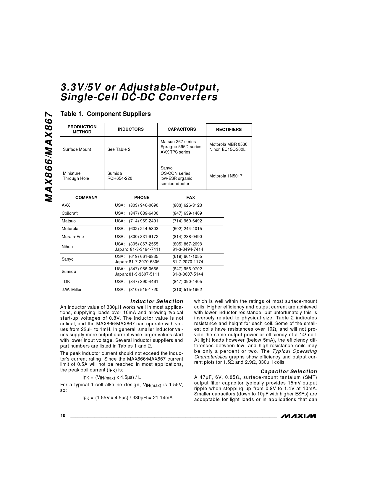 3.3V/5V or Adjustable-Output, Single-Cell DC-DC ConvertersTable 1. Component SuppliersPRODUCTIONINDUCTORSCAPACITORSRECTIFIERSMETHOD Matsuo 267 series Motorola MBR 0530 Sprague 595D series Surface Mount See Table 2 Nihon EC15QS02L AVX TPS series Sanyo Miniature Sumida OS-CON series Motorola 1N5017 Through Hole RCH654-220 low-ESR organic semiconductor MAX866/MAX867COMPANYPHONEFAX AVX USA: (803) 946-0690 (803) 626-3123 Coilcraft USA: (847) 639-6400 (847) 639-1469 Matsuo USA: (714) 969-2491 (714) 960-6492 Motorola USA: (602) 244-5303 (602) 244-4015 Murata-Erie USA: (800) 831-9172 (814) 238-0490 USA: (805) 867-2555 (805) 867-2698 Nihon Japan: 81-3-3494-7411 81-3-3494-7414 USA: (619) 661-6835 (619) 661-1055 Sanyo Japan: 81-7-2070-6306 81-7-2070-1174 USA: (847) 956-0666 (847) 956-0702 Sumida Japan: 81-3-3607-5111 81-3-3607-5144 TDK USA: (847) 390-4461 (847) 390-4405 J.W. Miller USA: (310) 515-1720 (310) 515-1962 Inductor Selection which is well within the ratings of most surface-mount An inductor value of 330µH works well in most applica- coils. Higher efficiency and output current are achieved tions, supplying loads over 10mA and allowing typical with lower inductor resistance, but unfortunately this is start-up voltages of 0.8V. The inductor value is not inversely related to physical size. Table 2 indicates critical, and the MAX866/MAX867 can operate with val- resistance and height for each coil. Some of the small- ues from 22µH to 1mH. In general, smaller inductor val- est coils have resistances over 10Ω, and will not pro- ues supply more output current while larger values start vide the same output power or efficiency of a 1Ω coil. with lower input voltage. Several inductor suppliers and At light loads however (below 5mA), the efficiency dif- part numbers are listed in Tables 1 and 2. ferences between low- and high-resistance coils may The peak inductor current should not exceed the induc- be only a percent or two. The Typical Operating tor’s current rating. Since the MAX866/MAX867 current Characteristics graphs show efficiency and output cur- limit of 0.5A will not be reached in most applications, rent plots for 1.5Ω and 2.9Ω, 330µH coils. the peak coil current (IPK) is: Capacitor Selection IPK = (VIN(max) x 4.5µs) / L A 47µF, 6V, 0.85Ω, surface-mount tantalum (SMT) For a typical 1-cell alkaline design, V output filter capacitor typically provides 15mV output IN(max) is 1.55V, so: ripple when stepping up from 0.9V to 1.4V at 10mA. Smaller capacitors (down to 10µF with higher ESRs) are IPK = (1.55V x 4.5µs) / 330µH = 21.14mA acceptable for light loads or in applications that can 10______________________________________________________________________________________
