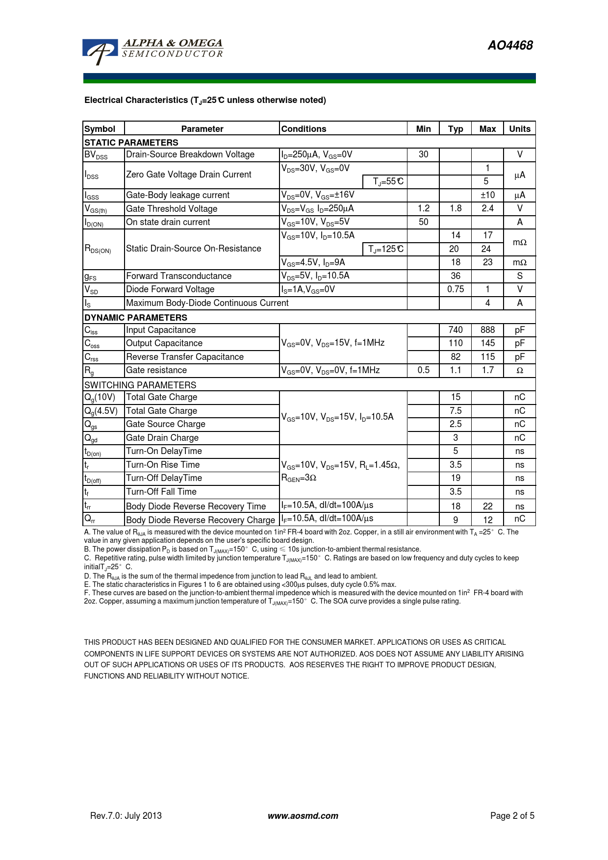 AO4468Electrical Characteristics (TJ=25°C unless otherwise noted)SymbolParameterConditionsMinTypMaxUnitsSTATIC PARAMETERS BV I DSS Drain-Source Breakdown Voltage D=250µA, VGS=0V 30 V VDS=30V, VGS=0V 1 IDSS Zero Gate Voltage Drain Current µA TJ=55°C 5 I Gate-Body leakage current V GSS DS=0V, VGS=±16V ±10 µA VGS(th) Gate Threshold Voltage VDS=VGS ID=250µA 1.2 1.8 2.4 V I V D(ON) On state drain current GS=10V, VDS=5V 50 A VGS=10V, ID=10.5A 14 17 mΩ RDS(ON) Static Drain-Source On-Resistance TJ=125°C 20 24 VGS=4.5V, ID=9A 18 23 mΩ g Forward Transconductance V FS DS=5V, ID=10.5A 36 S V Diode Forward Voltage I SD S=1A,VGS=0V 0.75 1 V IS Maximum Body-Diode Continuous Current 4 A DYNAMIC PARAMETERS Ciss Input Capacitance 740 888 pF C V oss Output Capacitance GS=0V, VDS=15V, f=1MHz 110 145 pF Crss Reverse Transfer Capacitance 82 115 pF R Gate resistance V g GS=0V, VDS=0V, f=1MHz 0.5 1.1 1.7 Ω SWITCHING PARAMETERS Qg(10V) Total Gate Charge 15 nC Qg(4.5V) Total Gate Charge 7.5 nC VGS=10V, VDS=15V, ID=10.5A Qgs Gate Source Charge 2.5 nC Qgd Gate Drain Charge 3 nC tD(on) Turn-On DelayTime 5 ns t Tu T r u n- n On O n Ri R se e Ti T me m V =10V, V =15V, R =1.45 r GS=10V, VDS=15V, RL=1.4 Ω 5 , 3. 3 5 ns n t R D(off) Turn-Off DelayTime GEN=3Ω 19 ns tf Turn-Off Fall Time 3.5 ns trr IF=10.5A, dI/dt=100A/µs Body Diode Reverse Recovery Time 18 22 ns Qrr Body Diode Reverse Recovery Charge IF=10.5A, dI/dt=100A/µs 9 12 nC A. The value of Rθ is measured with the device mounted on 1in2 FR-4 board with 2oz. Copper, in a still air environment with T =25°C. The JA A value in any given application depends on the user's specific board design. B. The power dissipation P is based on T =150°C, using ≤ 10s junction-to-ambient thermal resistance. D J(MAX) C. Repetitive rating, pulse width limited by junction temperature T =150°C. Ratings are based on low frequency and duty cycles to keep J(MAX) initialT =25°C. J D. The Rθ is the sum of the thermal impedence from junction to lead R and lead to ambient. JA θJL E. The static characteristics in Figures 1 to 6 are obtained using <300µs pulses, duty cycle 0.5% max. F. These curves are based on the junction-to-ambient thermal impedence which is measured with the device mounted on 1in2 FR-4 board with 2oz. Copper, assuming a maximum junction temperature of T =150°C. The SOA curve provides a single pulse rating. J(MAX) THIS PRODUCT HAS BEEN DESIGNED AND QUALIFIED FOR THE CONSUMER MARKET. APPLICATIONS OR USES AS CRITICAL COMPONENTS IN LIFE SUPPORT DEVICES OR SYSTEMS ARE NOT AUTHORIZED. AOS DOES NOT ASSUME ANY LIABILITY ARISING OUT OF SUCH APPLICATIONS OR USES OF ITS PRODUCTS. AOS RESERVES THE RIGHT TO IMPROVE PRODUCT DESIGN, FUNCTIONS AND RELIABILITY WITHOUT NOTICE. Rev.7.0: July 2013 www.aosmd.com Page 2 of 5