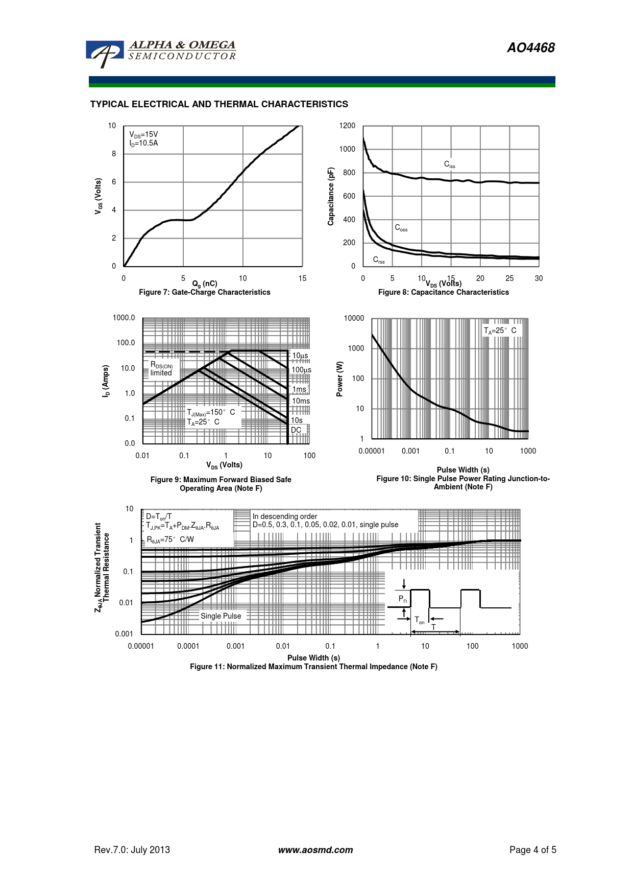 AO4468 TYPICAL ELECTRICAL AND THERMAL CHARACTERISTICS lts c n ita S G a p a Q (nC) (Volts) Figure 7: Gate-Charge Characteristics