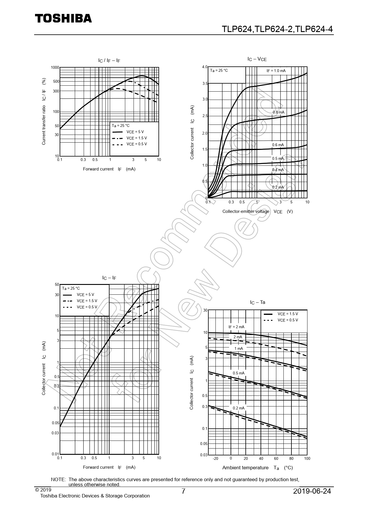 TLP624,TLP624-2,TLP624-4. IC. /. IF. –. IF. IC. –. VCE. 1000. 4.0. Ta. =. 25. °C. IF. =. 1.0. mA. ). (%. 500. 3.5. F/. I. 300. I. C. 3.0. io. ). 100. (mA. 0.8. mA. fer. rat. 2.5. 50. Ta. =. 25. °C. I. C. t