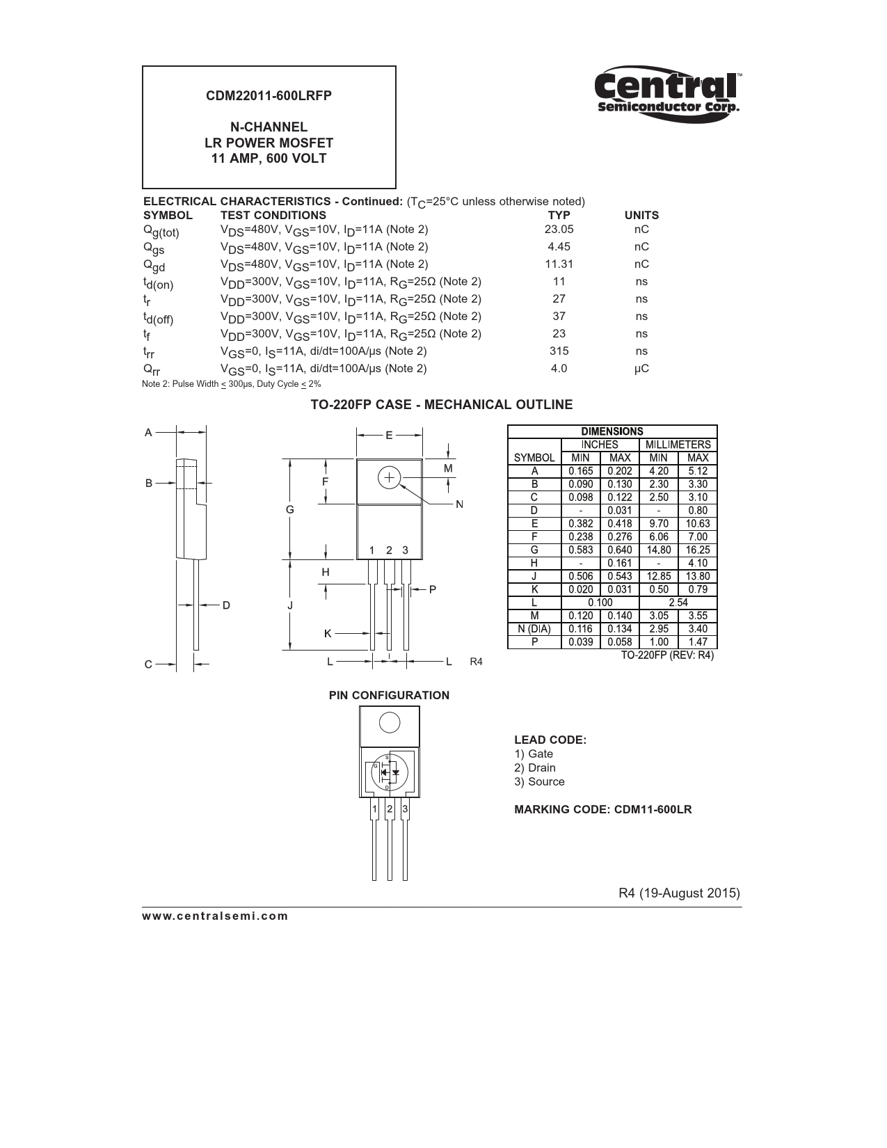 CDM22011-600LRFP. N-CHANNEL. LR POWER MOSFET. 11 AMP, 600 VOLT. ELECTRICAL CHARACTERISTICS - Continued:. SYMBOL TEST. CONDITIONS. TYP
