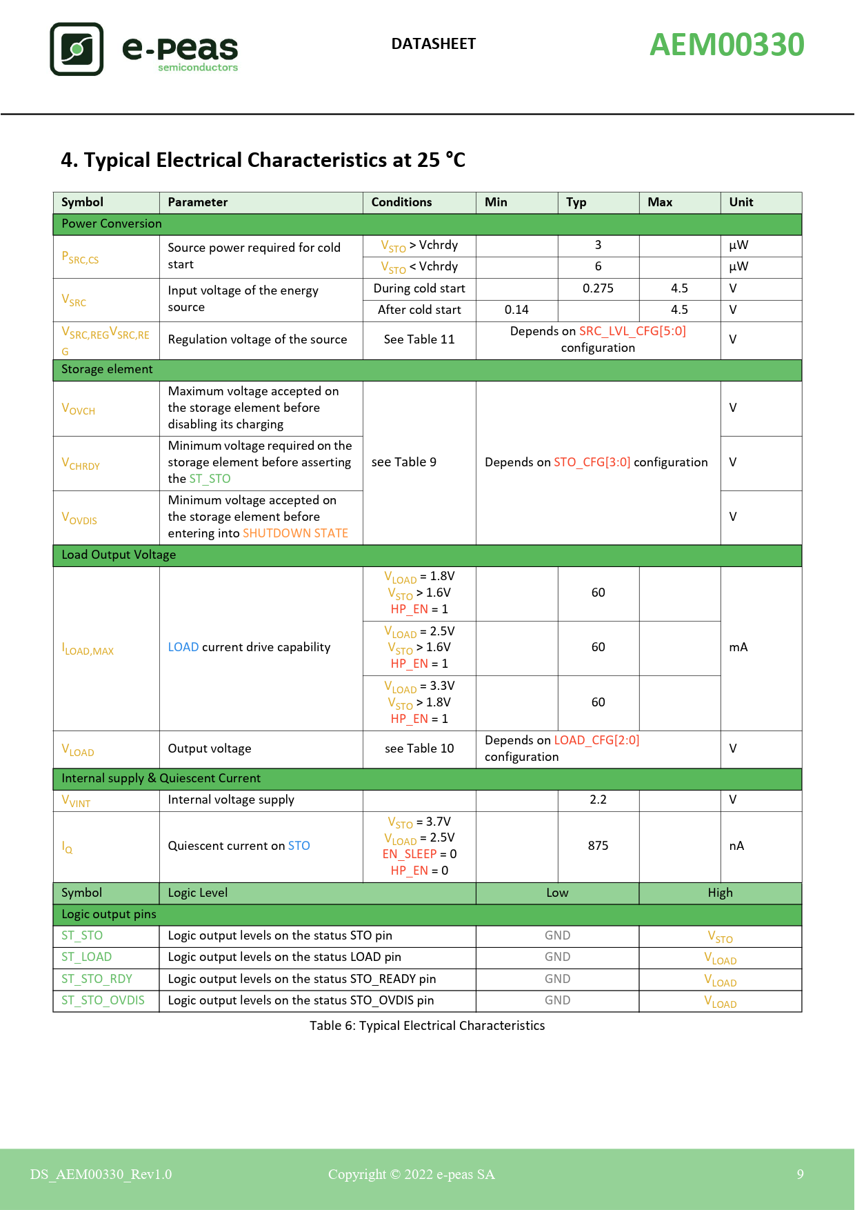 DATASHEET. AEM00330. 4. Typical Electrical Characteristics at 25 °C. Symbol. Parameter. Conditions. Min. Typ. Max. Unit