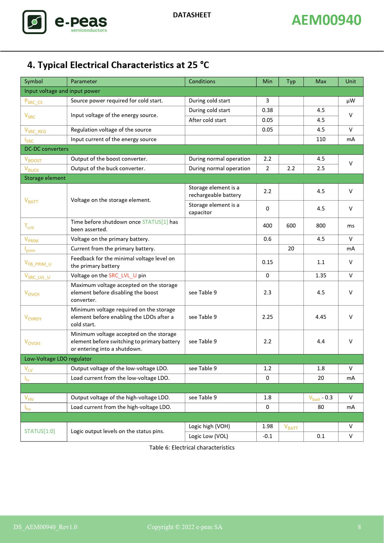 Symbol Parameter Conditions Min Typ Max Unit Input voltage and input power PSRC_CS Source power required for cold start. During cold start 3 µW During cold start 0.38 4.5 VSRC Input voltage of the energy source. V After cold start 0.05 4.5 VSRC_REG Regulation voltage of the source 0.05 4.5 V ISRC Input current of the energy source 110 mA DC-DC converters VBOOST Output of the boost converter. During normal operation 2.2 4.5 V VBUCK Output of the buck converter. During normal operation 2 2.2 2.5 Storage element Storage element is a rechargeable battery 2.2 4.5 V VBATT Voltage on the storage element. Storage element is a capacitor 0 4.5 V T Time before shutdown once STATUS[1] has crit been asserted. 400 600 800 ms VPRIM Voltage on the primary battery. 0.6 4.5 V Iprim Current from the primary battery. 20 mA V Feedback for the minimal voltage level on FB_PRIM_U the primary battery 0.15 1.1 V VSRC_LVL_U Voltage on the SRC_LVL_U pin 0 1.35 V Maximum voltage accepted on the storage VOVCH element before disabling the boost see Table 9 2.3 4.5 V converter. Minimum voltage required on the storage VCHRDY element before enabling the LDOs after a see Table 9 2.25 4.45 V cold start. Minimum voltage accepted on the storage VOVDIS element before switching to primary battery see Table 9 2.2 4.4 V or entering into a shutdown. Low-Voltage LDO regulator VLV Output voltage of the low-voltage LDO. see Table 9 1.2 1.8 V Ilv Load current from the low-voltage LDO. 0 20 mA VHV Output voltage of the high-voltage LDO. see Table 9 1.8 Vbatt - 0.3 V Ihv Load current from the high-voltage LDO. 0 80 mA Logic high (VOH) 1.98 V STATUS[1:0] Logic output levels on the status pins. BATT V Logic Low (VOL) -0.1 0.1 V Table 6: Electrical characteristics DS D _A _ E A M0 M 094 9 0_Rev e 1.0. 0 0 Copyr y ight h © 2022 2 e-pe p as a SA S Confidential 8 Document Outline 1. Introduction 2. Absolute Maximum Ratings 3. Thermal Resistance 4. Typical Electrical Characteristics at 25 °C 5. Recommended Operation Conditions 6. Functional Block Diagram 7. Theory of Operation 7.1. Deep sleep & Wake up modes 7.1.1. Supercapacitor as a storage element. 7.1.2. Battery as a storage element. 7.2. Normal mode 7.2.1. Boost 7.2.2. Buck 7.2.3. LDO outputs 7.3. Overcharge mode 7.4. Primary mode 7.5. Shutdown mode 7.6. Balun for dual-cell supercapacitor 8. System configuration 8.1. Battery and LDOs configuration 8.1.1. Custom mode 8.2. Source voltage configuration 8.3. Primary battery configuration 8.4. No-battery configuration 8.5. Storage element information 8.6. External inductors information 8.7. External capacitors information 9. Typical Application Circuits 9.1. Example circuit 1 9.2. Example circuit 2 10. Performance Data 10.1. BOOST conversion efficiency for LBOOST = 10 µH 10.2. BOOST conversion efficiency for LBOOST = 22 µH 10.3. Quiescent current 10.4. High-voltage LDO regulation 10.5. Low-voltage LDO regulation 10.6. High-voltage LDO efficiency 10.7. Low-voltage LDO efficiency 11. Schematic 12. Layout Package Information 13.1. Plastic Quad Flatpack No-lead (QFN 28-pin 5x5mm) 13.2. Board Layout 14. Revision History