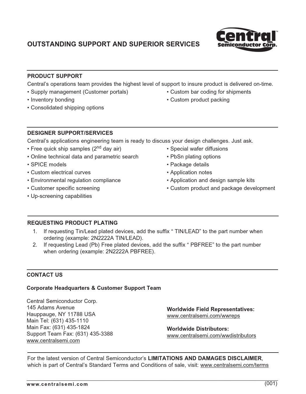 Central’s applications engineering team is ready to discuss your design challenges. Just ask. • Free quick ship samples (2nd day air) • Special wafer diffusions • Online technical data and parametric search • PbSn plating options • SPICE models • Package details • Custom electrical curves • Application notes • Environmental regulation compliance • Application and design sample kits • Customer specific screening • Custom product and package development • Up-screening capabilities