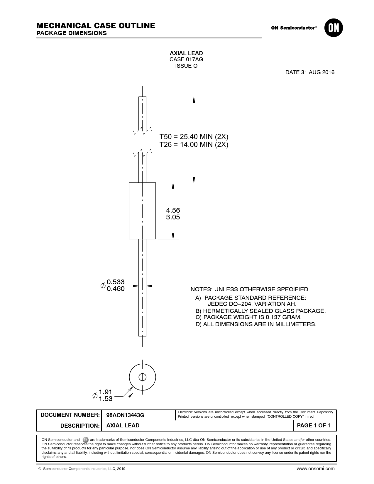 CASE 017AG ISSUE O DATE 31 AUG 2016 T50 = 25.40 MIN (2X) T26 = 14.00 MIN (2X) 4.56 3.05 0.533 0.460 NOTES: UNLESS OTHERWISE SPECIFIED A) PACKAGE STANDARD REFERENCE: JEDEC DO−204, VARIATION AH. B) HERMETICALLY SEALED GLASS PACKAGE. C) PACKAGE WEIGHT IS 0.137 GRAM. D) ALL DIMENSIONS ARE IN MILLIMETERS. 1.91 1.53
