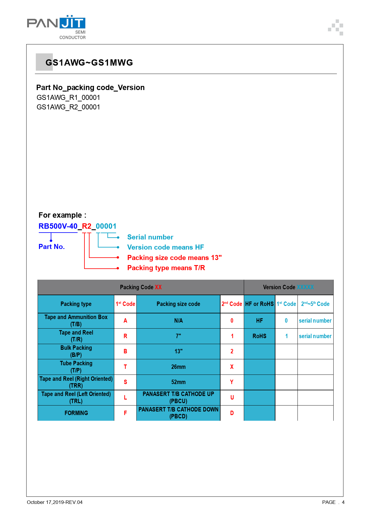 | Páginas / Página | 5 / 4 — GS1AWG~GS1MWG. Part No_packing code_Version. For example : … |