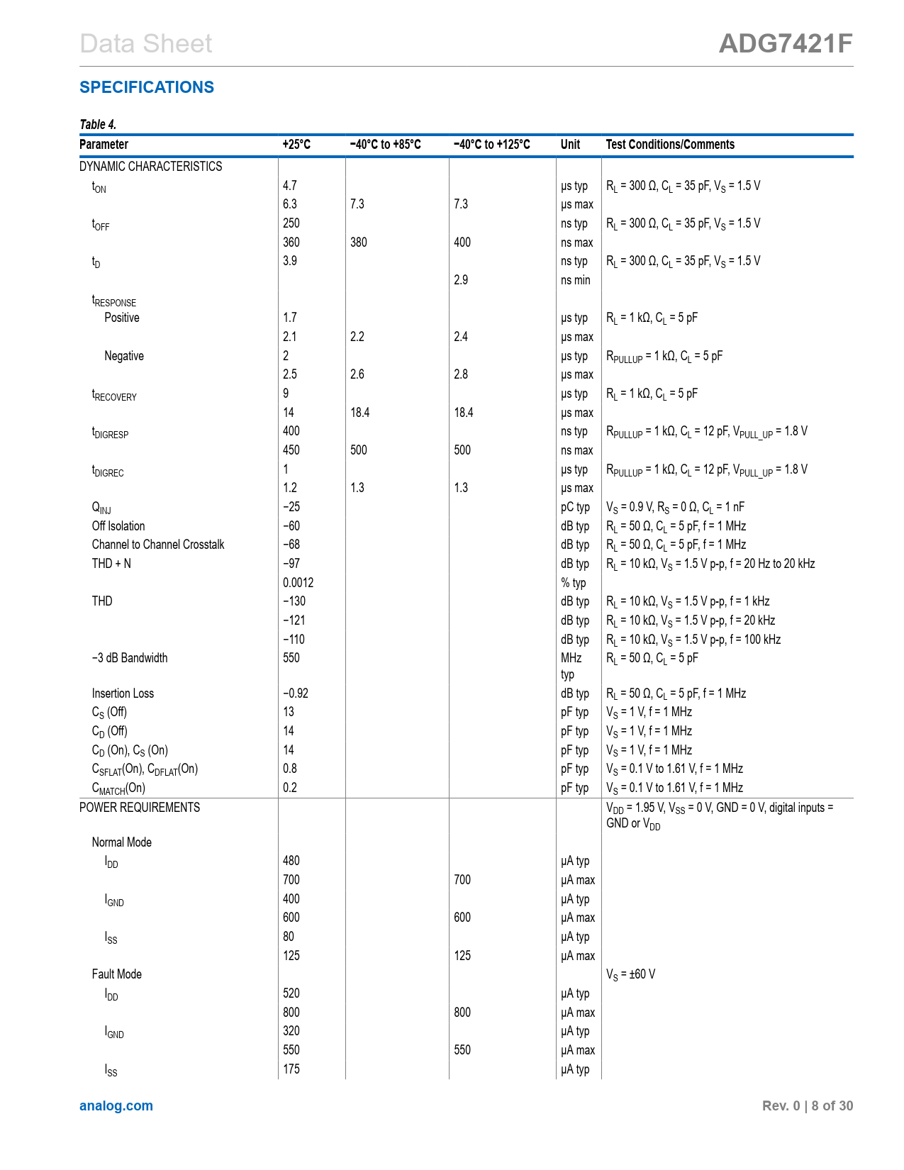 Data Sheet ADG7421FSPECIFICATIONSTable 4.Parameter+25°C−40°C to +85°C−40°C to +125°CUnitTest Conditions/Comments DYNAMIC CHARACTERISTICS tON 4.7 µs typ RL = 300 Ω, CL = 35 pF, VS = 1.5 V 6.3 7.3 7.3 µs max tOFF 250 ns typ RL = 300 Ω, CL = 35 pF, VS = 1.5 V 360 380 400 ns max tD 3.9 ns typ RL = 300 Ω, CL = 35 pF, VS = 1.5 V 2.9 ns min tRESPONSE Positive 1.7 µs typ RL = 1 kΩ, CL = 5 pF 2.1 2.2 2.4 µs max Negative 2 µs typ RPULLUP = 1 kΩ, CL = 5 pF 2.5 2.6 2.8 µs max tRECOVERY 9 µs typ RL = 1 kΩ, CL = 5 pF 14 18.4 18.4 µs max tDIGRESP 400 ns typ RPULLUP = 1 kΩ, CL = 12 pF, VPULL_UP = 1.8 V 450 500 500 ns max tDIGREC 1 µs typ RPULLUP = 1 kΩ, CL = 12 pF, VPULL_UP = 1.8 V 1.2 1.3 1.3 µs max QINJ −25 pC typ VS = 0.9 V, RS = 0 Ω, CL = 1 nF Off Isolation −60 dB typ RL = 50 Ω, CL = 5 pF, f = 1 MHz Channel to Channel Crosstalk −68 dB typ RL = 50 Ω, CL = 5 pF, f = 1 MHz THD + N −97 dB typ RL = 10 kΩ, VS = 1.5 V p-p, f = 20 Hz to 20 kHz 0.0012 % typ THD −130 dB typ RL = 10 kΩ, VS = 1.5 V p-p, f = 1 kHz −121 dB typ RL = 10 kΩ, VS = 1.5 V p-p, f = 20 kHz −110 dB typ RL = 10 kΩ, VS = 1.5 V p-p, f = 100 kHz −3 dB Bandwidth 550 MHz RL = 50 Ω, CL = 5 pF typ Insertion Loss −0.92 dB typ RL = 50 Ω, CL = 5 pF, f = 1 MHz CS (Off) 13 pF typ VS = 1 V, f = 1 MHz CD (Off) 14 pF typ VS = 1 V, f = 1 MHz CD (On), CS (On) 14 pF typ VS = 1 V, f = 1 MHz CSFLAT(On), CDFLAT(On) 0.8 pF typ VS = 0.1 V to 1.61 V, f = 1 MHz CMATCH(On) 0.2 pF typ VS = 0.1 V to 1.61 V, f = 1 MHz POWER REQUIREMENTS VDD = 1.95 V, VSS = 0 V, GND = 0 V, digital inputs = GND or VDD Normal Mode IDD 480 µA typ 700 700 µA max IGND 400 µA typ 600 600 µA max ISS 80 µA typ 125 125 µA max Fault Mode VS = ±60 V IDD 520 µA typ 800 800 µA max IGND 320 µA typ 550 550 µA max ISS 175 µA typ analog.comRev. 0 | 8 of 30 Document Outline Features Applications Companion Products Functional Block Diagram General Description Product Highlights Specifications 5 V Single Supply 3 V Single Supply 1.8 V Single Supply ±2.5 V Dual Supply Continuous Current per Channel, Sx or Dx, Two Channels On Absolute Maximum Ratings Thermal Resistance Electrostatic Discharge (ESD) Ratings ESD Ratings for ADG7421F ESD Caution Pin Configuration and Function Descriptions Typical Performance Characteristics Test Circuits Terminology IDD ISS VD, VS RON RFLAT (ON) IS (Off) ID (Off) ID (On), IS (On) VINL VINH IINL, IINH CD (Off) CS (Off) CD (On), CS (On) CIN tON tOFF tDIGRESP tDIGREC tRESPONSE tRECOVERY Off Isolation Charge Injection −3 dB Bandwidth On Response Insertion Loss THD + N AC Power Supply Rejection Ratio (AC PSRR) VT Theory of Operation Switch Architecture ESD Performance Trench Isolation Overvoltage Fault Protection Power-On Protection Power-Off Protection Overvoltage Interrupt Flag Applications Information Power Supply Rails Power Supply Recommendations Power Supply Sequencing Protection Signal Range Intelligent Fault Detection Short Duration Fault Current Thermocouple Input Protection RTD Input Protection Switches in a Known State High Voltage Suppression Outline Dimensions Ordering Guide