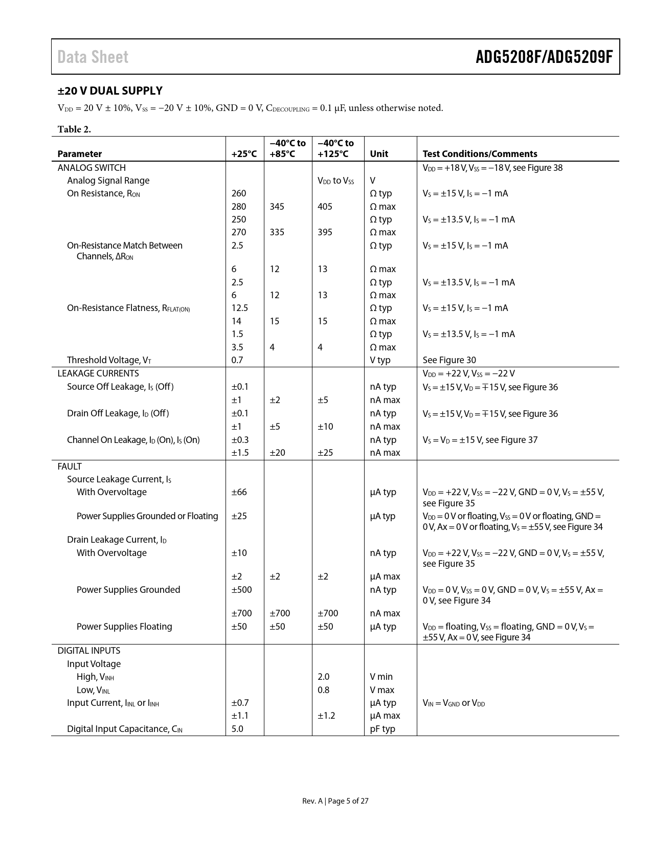 link to page 20 link to page 18 link to page 20 link to page 20 link to page 20 link to page 20 link to page 20 link to page 20 link to page 20 link to page 20 Data SheetADG5208F/ADG5209F±20 V DUAL SUPPLY VDD = 20 V ± 10%, VSS = −20 V ± 10%, GND = 0 V, CDECOUPLING = 0.1 µF, unless otherwise noted. Table 2.−40°C to −40°C toParameter+25°C +85°C+125°CUnitTest Conditions/Comments ANALOG SWITCH VDD = +18 V, VSS = −18 V, see Figure 38 Analog Signal Range VDD to VSS V On Resistance, RON 260 Ω typ VS = ±15 V, IS = −1 mA 280 345 405 Ω max 250 Ω typ VS = ±13.5 V, IS = −1 mA 270 335 395 Ω max On-Resistance Match Between 2.5 Ω typ VS = ±15 V, IS = −1 mA Channels, ∆RON 6 12 13 Ω max 2.5 Ω typ VS = ±13.5 V, IS = −1 mA 6 12 13 Ω max On-Resistance Flatness, RFLAT(ON) 12.5 Ω typ VS = ±15 V, IS = −1 mA 14 15 15 Ω max 1.5 Ω typ VS = ±13.5 V, IS = −1 mA 3.5 4 4 Ω max Threshold Voltage, VT 0.7 V typ See Figure 30 LEAKAGE CURRENTS VDD = +22 V, VSS = −22 V Source Off Leakage, IS (Off) ±0.1 nA typ VS = ±15 V, VD = ∓15 V, see Figure 36 ±1 ±2 ±5 nA max Drain Off Leakage, ID (Off) ±0.1 nA typ VS = ±15 V, VD = ∓15 V, see Figure 36 ±1 ±5 ±10 nA max Channel On Leakage, ID (On), IS (On) ±0.3 nA typ VS = VD = ±15 V, see Figure 37 ±1.5 ±20 ±25 nA max FAULT Source Leakage Current, IS With Overvoltage ±66 µA typ VDD = +22 V, VSS = −22 V, GND = 0 V, VS = ±55 V, see Figure 35 Power Supplies Grounded or Floating ±25 µA typ VDD = 0 V or floating, VSS = 0 V or floating, GND = 0 V, Ax = 0 V or floating, VS = ±55 V, see Figure 34 Drain Leakage Current, ID With Overvoltage ±10 nA typ VDD = +22 V, VSS = −22 V, GND = 0 V, VS = ±55 V, see Figure 35 ±2 ±2 ±2 µA max Power Supplies Grounded ±500 nA typ VDD = 0 V, VSS = 0 V, GND = 0 V, VS = ±55 V, Ax = 0 V, see Figure 34 ±700 ±700 ±700 nA max Power Supplies Floating ±50 ±50 ±50 µA typ VDD = floating, VSS = floating, GND = 0 V, VS = ±55 V, Ax = 0 V, see Figure 34 DIGITAL INPUTS Input Voltage High, VINH 2.0 V min Low, VINL 0.8 V max Input Current, IINL or IINH ±0.7 µA typ VIN = VGND or VDD ±1.1 ±1.2 µA max Digital Input Capacitance, CIN 5.0 pF typ Rev. A | Page 5 of 27 Document Outline FEATURES APPLICATIONS FUNCTIONAL BLOCK DIAGRAMS GENERAL DESCRIPTION PRODUCT HIGHLIGHTS TABLE OF CONTENTS REVISION HISTORY SPECIFICATIONS ±15 V DUAL SUPPLY ±20 V DUAL SUPPLY 12 V SINGLE SUPPLY 36 V SINGLE SUPPLY CONTINUOUS CURRENT PER CHANNEL, Sx, D, OR Dx ABSOLUTE MAXIMUM RATINGS ESD CAUTION PIN CONFIGURATIONS AND FUNCTION DESCRIPTIONS TYPICAL PERFORMANCE CHARACTERISTICS TEST CIRCUITS TERMINOLOGY THEORY OF OPERATION SWITCH ARCHITECTURE Overvoltage Reaction ESD Performance Trench Isolation FAULT PROTECTION Power-On Protection Power-Off Protection Digital Input Protection APPLICATIONS INFORMATION POWER SUPPLY RAILS POWER SUPPLY SEQUENCING PROTECTION SIGNAL RANGE POWER SUPPLY RECOMMENDATIONS HIGH VOLTAGE SURGE SUPPRESSION LARGE VOLTAGE, HIGH FREQUENCY SIGNALS OUTLINE DIMENSIONS ORDERING GUIDE