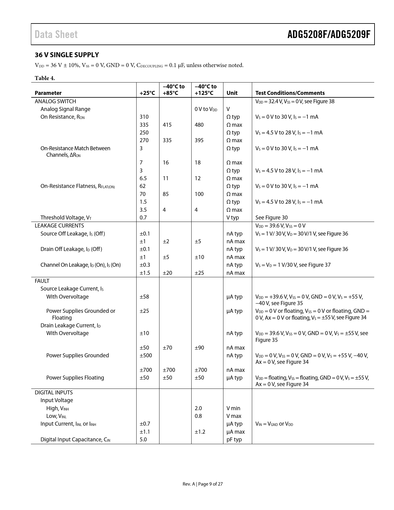 Data Sheet. ADG5208F/ADG5209F. 36 V SINGLE SUPPLY. Table 4. −40°C to. Parameter. +25°C +85°C. +125°C. Unit. Test Conditions/Comments