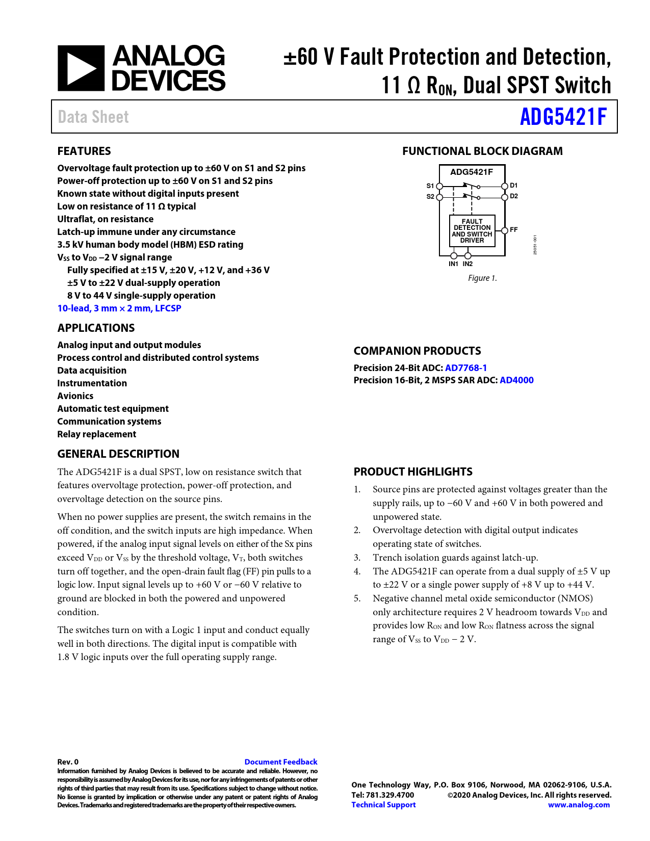 ±60 V Fault Protection and Detection,. 11 Ω RON, Dual SPST Switch. Data Sheet. ADG5421F. FEATURES. FUNCTIONAL BLOCK DIAGRAM