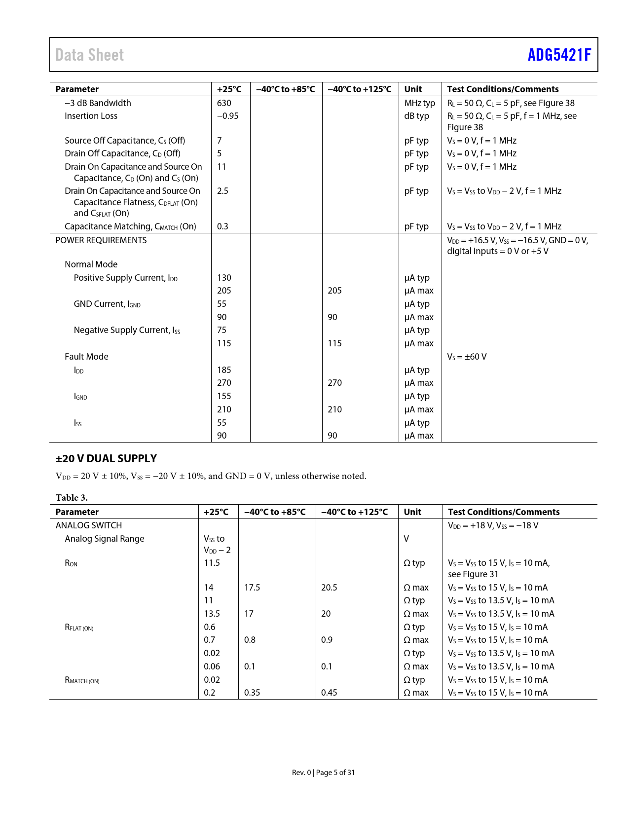 link to page 22 link to page 22 link to page 21 Data SheetADG5421FParameter+25°C−40°C to +85°C −40°C to +125°C UnitTest Conditions/Comments −3 dB Bandwidth 630 MHz typ RL = 50 Ω, CL = 5 pF, see Figure 38 Insertion Loss −0.95 dB typ RL = 50 Ω, CL = 5 pF, f = 1 MHz, see Figure 38 Source Off Capacitance, CS (Off) 7 pF typ VS = 0 V, f = 1 MHz Drain Off Capacitance, CD (Off) 5 pF typ VS = 0 V, f = 1 MHz Drain On Capacitance and Source On 11 pF typ VS = 0 V, f = 1 MHz Capacitance, CD (On) and CS (On) Drain On Capacitance and Source On 2.5 pF typ VS = VSS to VDD − 2 V, f = 1 MHz Capacitance Flatness, CDFLAT (On) and CSFLAT (On) Capacitance Matching, CMATCH (On) 0.3 pF typ VS = VSS to VDD − 2 V, f = 1 MHz POWER REQUIREMENTS VDD = +16.5 V, VSS = −16.5 V, GND = 0 V, digital inputs = 0 V or +5 V Normal Mode Positive Supply Current, IDD 130 µA typ 205 205 µA max GND Current, IGND 55 µA typ 90 90 µA max Negative Supply Current, ISS 75 µA typ 115 115 µA max Fault Mode VS = ±60 V IDD 185 µA typ 270 270 µA max IGND 155 µA typ 210 210 µA max ISS 55 µA typ 90 90 µA max ±20 V DUAL SUPPLY VDD = 20 V ± 10%, VSS = −20 V ± 10%, and GND = 0 V, unless otherwise noted. Table 3. Parameter+25°C−40°C to +85°C−40°C to +125°CUnitTest Conditions/Comments ANALOG SWITCH VDD = +18 V, VSS = −18 V Analog Signal Range VSS to V VDD − 2 RON 11.5 Ω typ VS = VSS to 15 V, IS = 10 mA, see Figure 31 14 17.5 20.5 Ω max VS = VSS to 15 V, IS = 10 mA 11 Ω typ VS = VSS to 13.5 V, IS = 10 mA 13.5 17 20 Ω max VS = VSS to 13.5 V, IS = 10 mA RFLAT (ON) 0.6 Ω typ VS = VSS to 15 V, IS = 10 mA 0.7 0.8 0.9 Ω max VS = VSS to 15 V, IS = 10 mA 0.02 Ω typ VS = VSS to 13.5 V, IS = 10 mA 0.06 0.1 0.1 Ω max VS = VSS to 13.5 V, IS = 10 mA RMATCH (ON) 0.02 Ω typ VS = VSS to 15 V, IS = 10 mA 0.2 0.35 0.45 Ω max VS = VSS to 15 V, IS = 10 mA Rev. 0 | Page 5 of 31 Document Outline FEATURES APPLICATIONS GENERAL DESCRIPTION FUNCTIONAL BLOCK DIAGRAM COMPANION PRODUCTS PRODUCT HIGHLIGHTS TABLE OF CONTENTS REVISION HISTORY SPECIFICATIONS ±15 V DUAL SUPPLY ±20 V DUAL SUPPLY 12 V SINGLE SUPPLY 36 V SINGLE SUPPLY CONTINUOUS CURRENT PER CHANNEL, S OR D ABSOLUTE MAXIMUM RATINGS THERMAL RESISTANCE ELECTROSTATIC DISCHARGE (ESD) RATINGS ESD Ratings for ADG5421F ESD CAUTION PIN CONFIGURATION AND FUNCTION DESCRIPTIONS TYPICAL PERFORMANCE CHARACTERISTICS TEST CIRCUITS TERMINOLOGY THEORY OF OPERATION SWITCH ARCHITECTURE ESD Performance Trench Isolation OVERVOLTAGE FAULT PROTECTION Power-On Protection Power-Off Protection Overvoltage Interrupt Flag APPLICATIONS INFORMATION POWER SUPPLY RAILS POWER SUPPLY RECOMMENDATIONS POWER SUPPLY SEQUENCING PROTECTION SIGNAL RANGE INTELLIGENT FAULT DETECTION SWITCH IN A KNOWN STATE HIGH VOLTAGE SURGE SUPPRESSION RELATED PRODUCTS OUTLINE DIMENSIONS ORDERING GUIDE