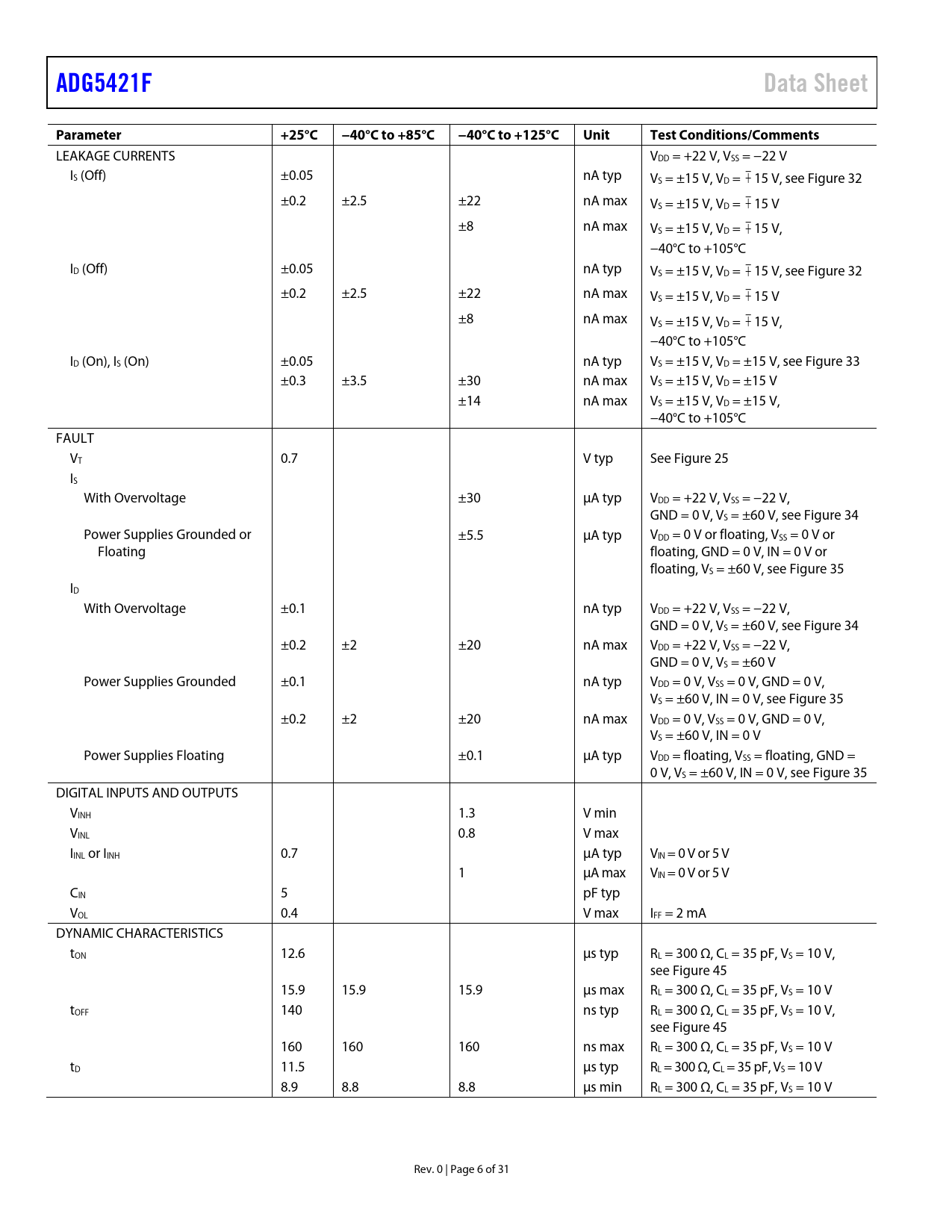 Páginas / Página31 / 6 — ADG5421F. Data Sheet. Parameter. +25°C. −40°C to +85°C. −40°C to +125°C. …