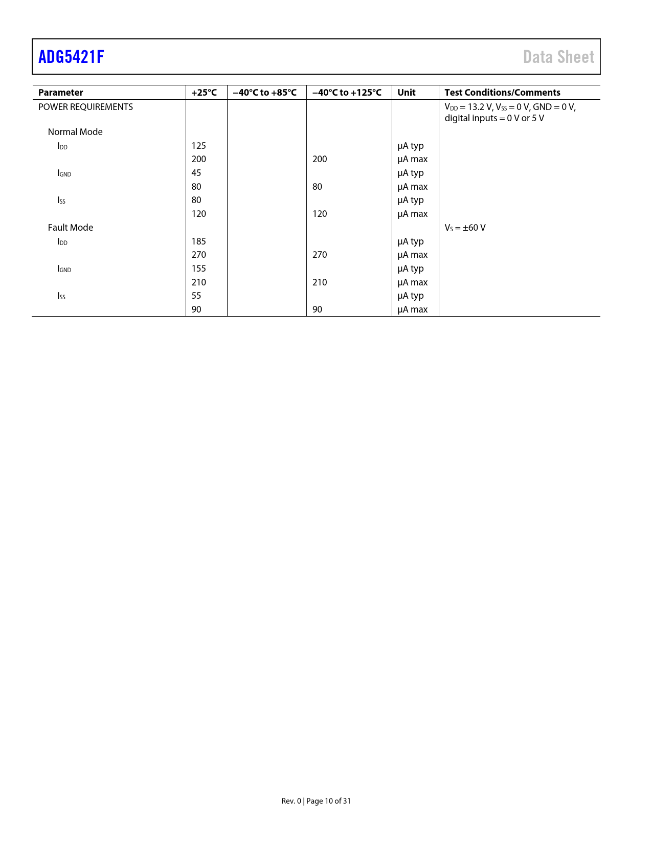 Páginas / Página31 / 10 — ADG5421F. Data Sheet. Parameter. +25°C. −40°C to +85°C. −40°C to +125°C. …