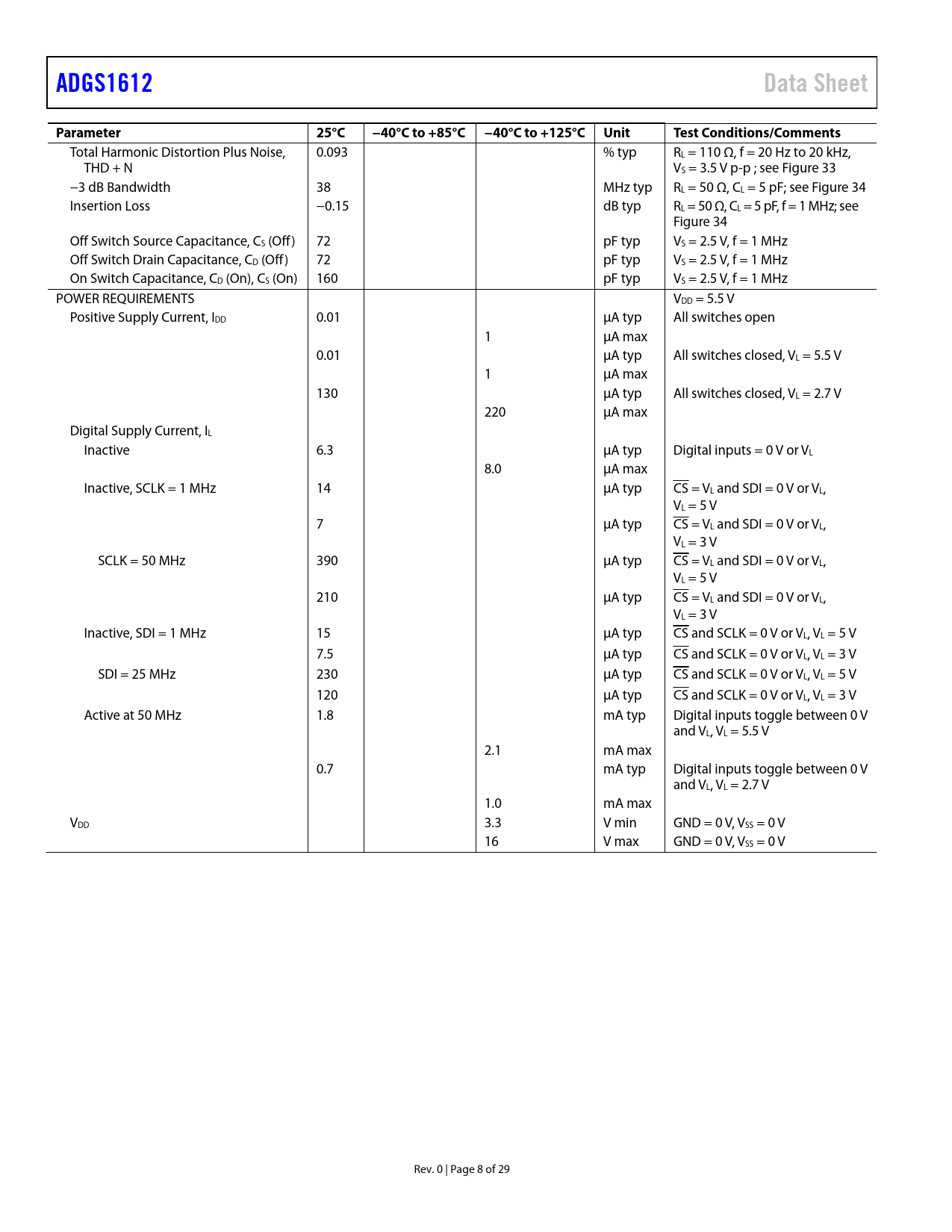 link to page 19 link to page 19 link to page 19 ADGS1612Data SheetParameter25°C−40°C to +85°C−40°C to +125°CUnitTest Conditions/Comments Total Harmonic Distortion Plus Noise, 0.093 % typ RL = 110 Ω, f = 20 Hz to 20 kHz, THD + N VS = 3.5 V p-p ; see Figure 33 −3 dB Bandwidth 38 MHz typ RL = 50 Ω, CL = 5 pF; see Figure 34 Insertion Loss −0.15 dB typ RL = 50 Ω, CL = 5 pF, f = 1 MHz; see Figure 34 Off Switch Source Capacitance, CS (Off ) 72 pF typ VS = 2.5 V, f = 1 MHz Off Switch Drain Capacitance, CD (Off ) 72 pF typ VS = 2.5 V, f = 1 MHz On Switch Capacitance, CD (On), CS (On) 160 pF typ VS = 2.5 V, f = 1 MHz POWER REQUIREMENTS VDD = 5.5 V Positive Supply Current, IDD 0.01 μA typ All switches open 1 μA max 0.01 μA typ All switches closed, VL = 5.5 V 1 μA max 130 μA typ All switches closed, VL = 2.7 V 220 μA max Digital Supply Current, IL Inactive 6.3 μA typ Digital inputs = 0 V or VL 8.0 μA max Inactive, SCLK = 1 MHz 14 μA typ CSE = VL and SDI = 0 V or VL, VL = 5 V 7 μA typ CSE = VL and SDI = 0 V or VL, VL = 3 V SCLK = 50 MHz 390 μA typ CSE = VL and SDI = 0 V or VL, VL = 5 V 210 μA typ CSE = VL and SDI = 0 V or VL, VL = 3 V Inactive, SDI = 1 MHz 15 μA typ CSE and SCLK = 0 V or VL, VL = 5 V 7.5 μA typ CSE and SCLK = 0 V or VL, VL = 3 V SDI = 25 MHz 230 μA typ CSE and SCLK = 0 V or VL, VL = 5 V 120 μA typ CSE and SCLK = 0 V or VL, VL = 3 V Active at 50 MHz 1.8 mA typ Digital inputs toggle between 0 V and VL, VL = 5.5 V 2.1 mA max 0.7 mA typ Digital inputs toggle between 0 V and VL, VL = 2.7 V 1.0 mA max VDD 3.3 V min GND = 0 V, VSS = 0 V 16 V max GND = 0 V, VSS = 0 V Rev. 0 | Page 8 of 29 Document Outline Features Applications Functional Block Diagram General Description Product Highlights Revision History Specifications ±5 V Dual Supply 12 V Single Supply 5 V Single Supply 3.3 V Single Supply Continuous Current per Channel, Sx or Dx Timing Characteristics Timing Diagrams Absolute Maximum Ratings Thermal Resistance ESD Caution Pin Configuration and Function Descriptions Typical Performance Characteristics Test Circuits Terminology Theory of Operation Address Mode Error Detection Features Cyclic Redundancy Check (CRC) Error Detection SCLK Count Error Detection Invalid Read/Write Address Error Clearing the Error Flags Register Burst Mode Software Reset Daisy-Chain Mode Power-On Reset Applications Information Break-Before-Make Switching Digital Input Buffers Power Supply Rails Register Summary Register Details Switch Data Register Address: 0x01, Reset: 0x00, Name: SW_DATA Error Configuration Register Address: 0x02, Reset: 0x06, Name: ERR_CONFIG Error Flags Register Address: 0x03, Reset: 0x00, Name: ERR_FLAGS Burst Enable Register Address: 0x05, Reset: 0x00, Name: BURST_EN Software Reset Register Address: 0x0B, Reset: 0x00, Name: SOFT_RESETB Outline Dimensions Ordering Guide