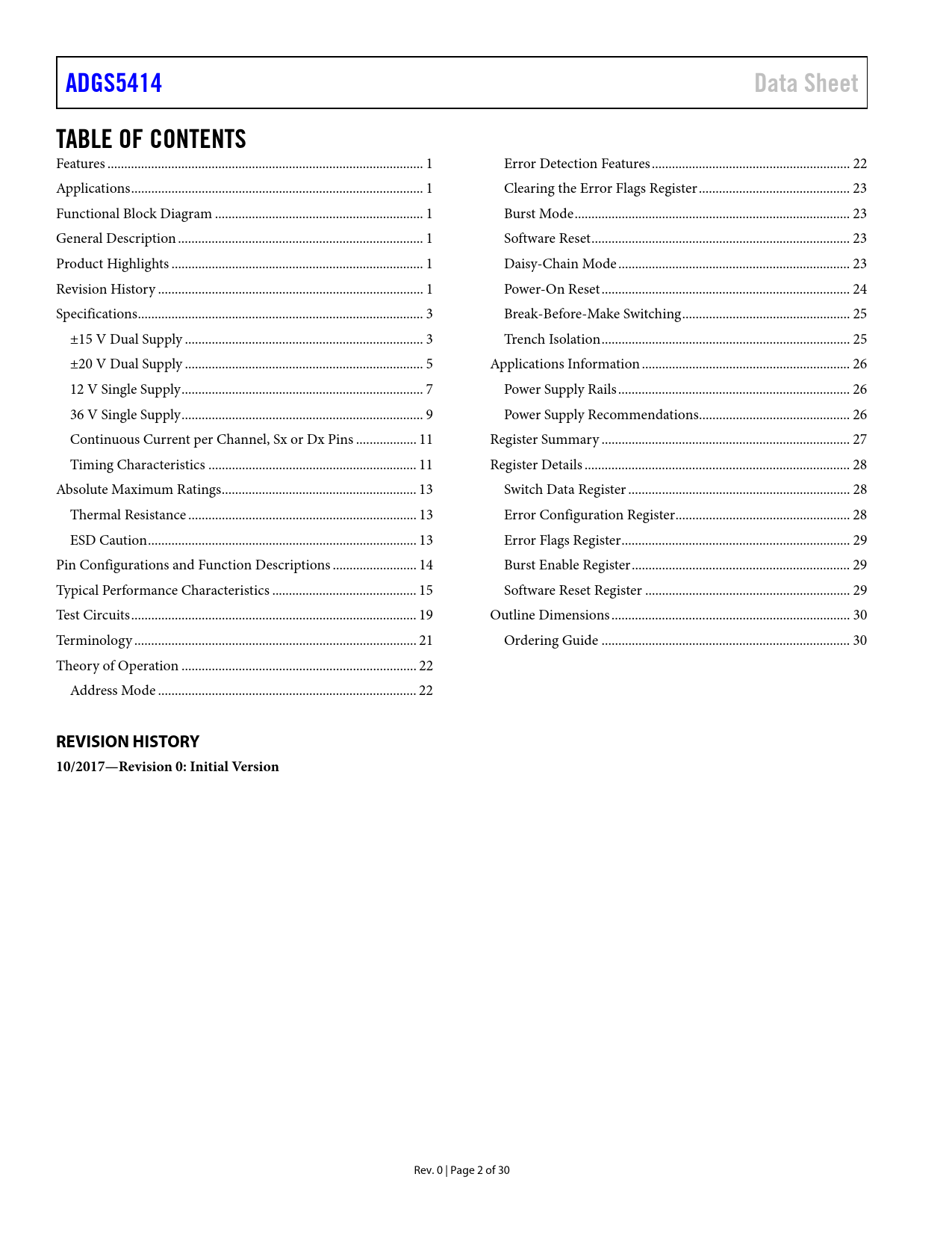 Páginas / Página30 / 2 — ADGS5414. Data Sheet. TABLE OF CONTENTS. REVISION HISTORY. …
