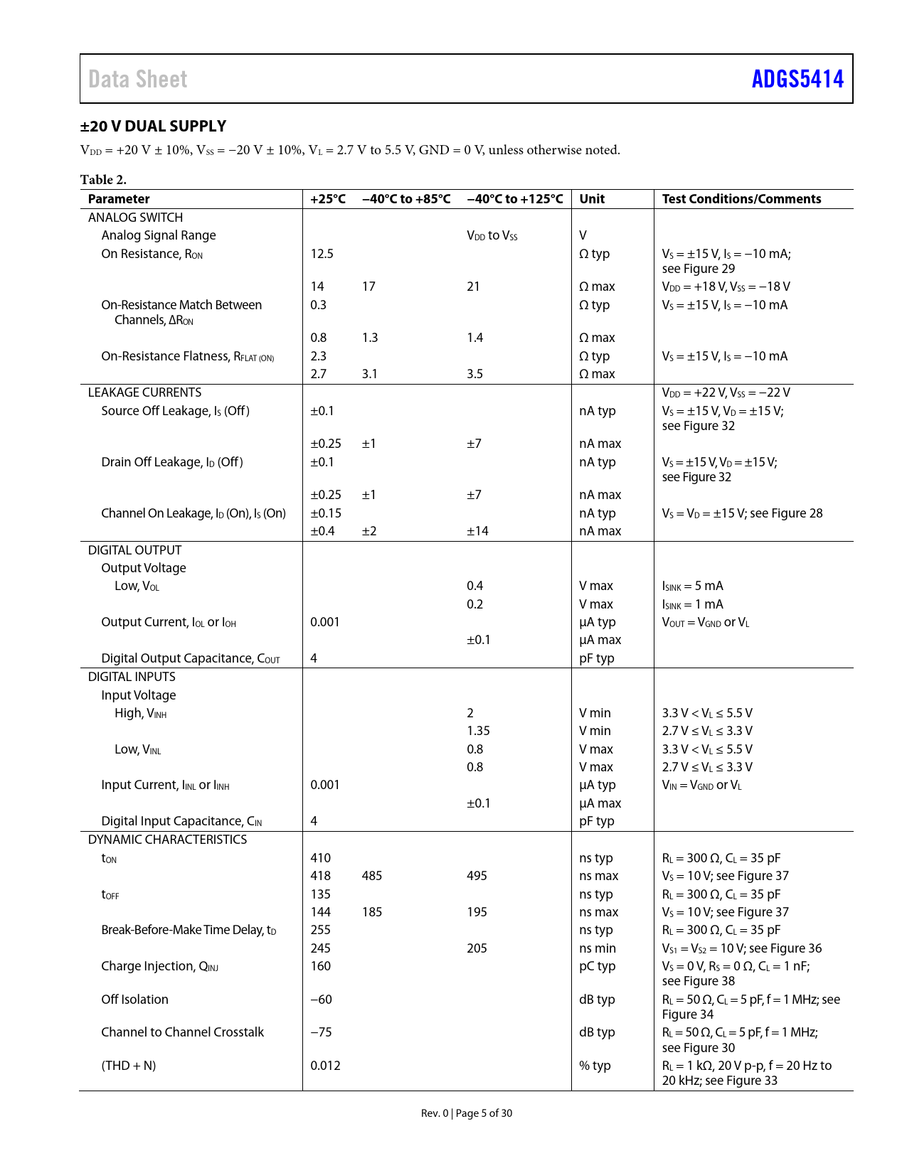 Data Sheet. ADGS5414. ±20 V DUAL SUPPLY. Table 2. Parameter. +25°C −40°C to +85°C. −40°C to +125°C. Unit. Test Conditions/Comments
