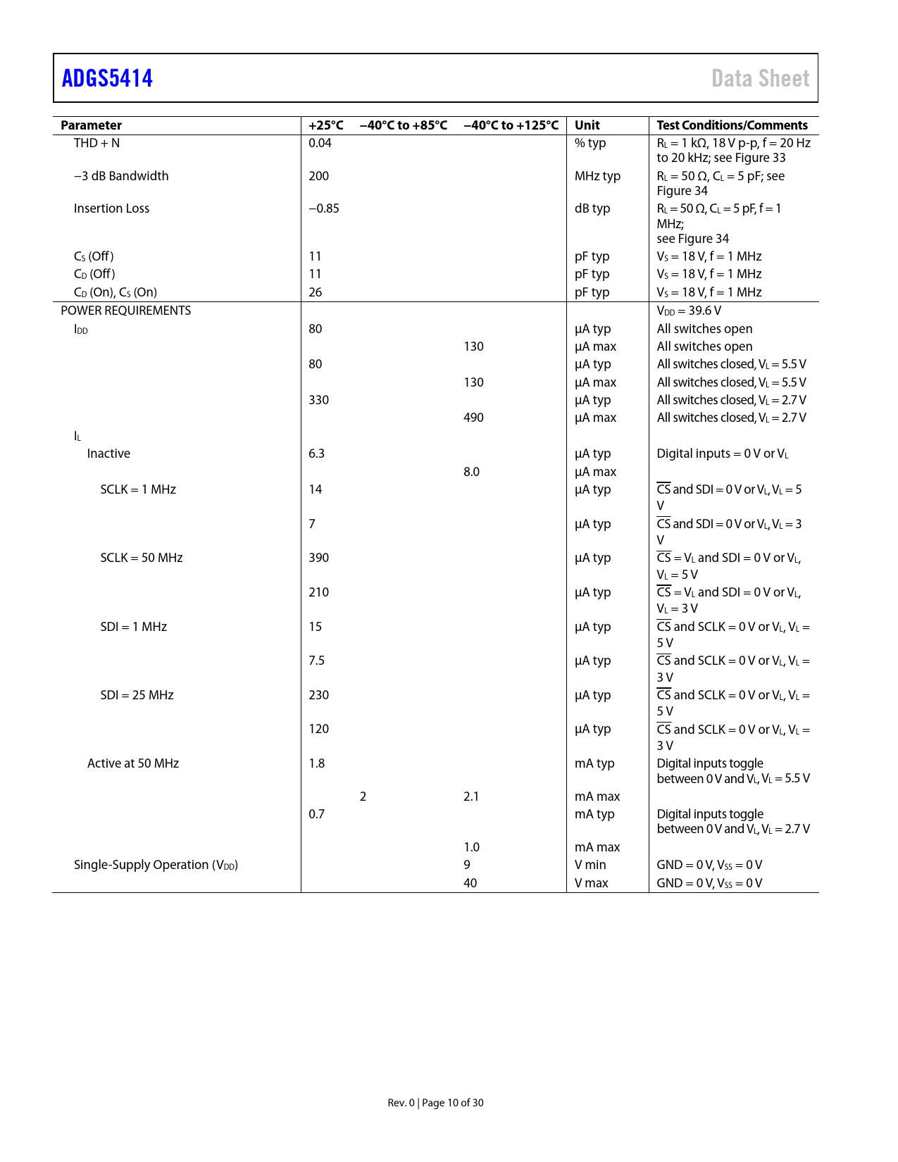Páginas / Página30 / 10 — ADGS5414. Data Sheet. Parameter. +25°C. −40°C to +85°C. −40°C to +125°C. …
