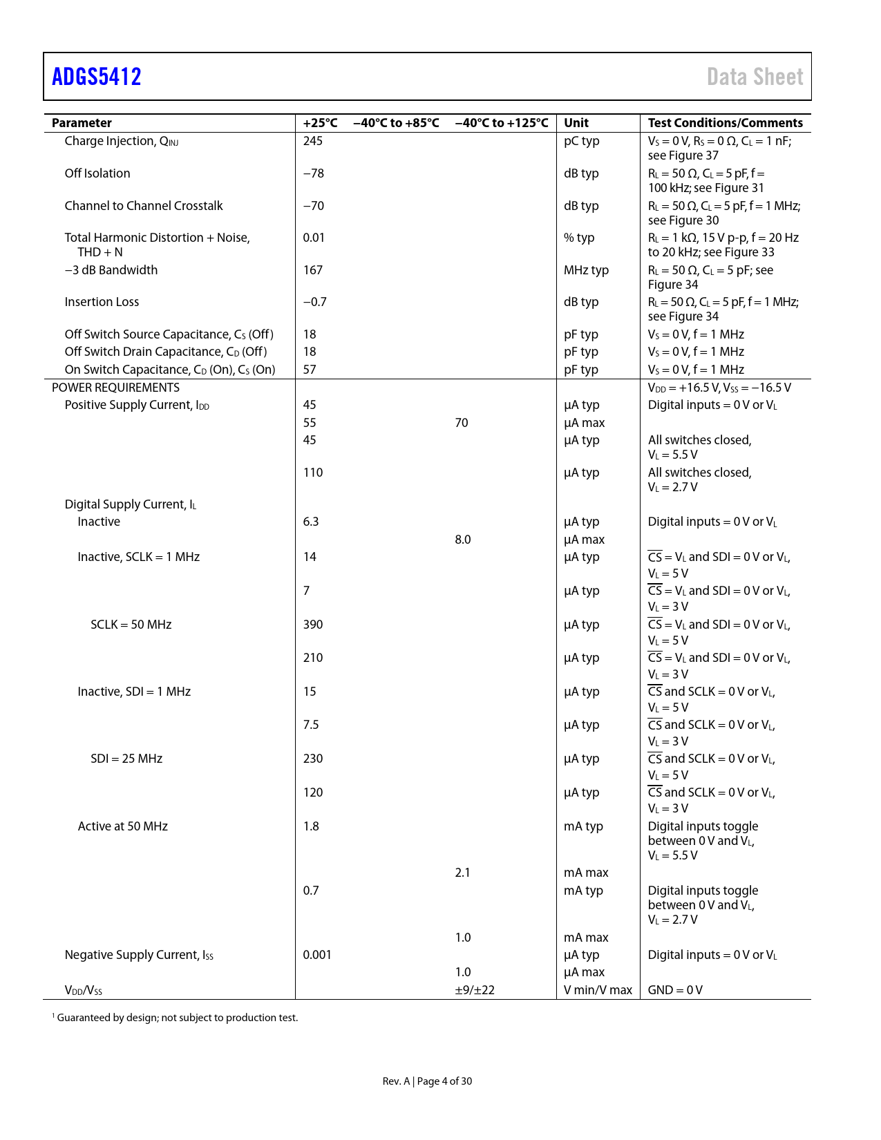 link to page 20 link to page 19 link to page 19 link to page 19 link to page 19 link to page 19 ADGS5412Data SheetParameter+25°C −40°C to +85°C −40°C to +125°C UnitTest Conditions/Comments Charge Injection, QINJ 245 pC typ VS = 0 V, RS = 0 Ω, CL = 1 nF; see Figure 37 Off Isolation −78 dB typ RL = 50 Ω, CL = 5 pF, f = 100 kHz; see Figure 31 Channel to Channel Crosstalk −70 dB typ RL = 50 Ω, CL = 5 pF, f = 1 MHz; see Figure 30 Total Harmonic Distortion + Noise, 0.01 % typ RL = 1 kΩ, 15 V p-p, f = 20 Hz THD + N to 20 kHz; see Figure 33 −3 dB Bandwidth 167 MHz typ RL = 50 Ω, CL = 5 pF; see Figure 34 Insertion Loss −0.7 dB typ RL = 50 Ω, CL = 5 pF, f = 1 MHz; see Figure 34 Off Switch Source Capacitance, CS (Off) 18 pF typ VS = 0 V, f = 1 MHz Off Switch Drain Capacitance, CD (Off) 18 pF typ VS = 0 V, f = 1 MHz On Switch Capacitance, CD (On), CS (On) 57 pF typ VS = 0 V, f = 1 MHz POWER REQUIREMENTS VDD = +16.5 V, VSS = −16.5 V Positive Supply Current, IDD 45 µA typ Digital inputs = 0 V or VL 55 70 µA max 45 µA typ All switches closed, VL = 5.5 V 110 µA typ All switches closed, VL = 2.7 V Digital Supply Current, IL Inactive 6.3 µA typ Digital inputs = 0 V or VL 8.0 µA max Inactive, SCLK = 1 MHz 14 µA typ CS = VL and SDI = 0 V or VL, VL = 5 V 7 µA typ CS = VL and SDI = 0 V or VL, VL = 3 V SCLK = 50 MHz 390 µA typ CS = VL and SDI = 0 V or VL, VL = 5 V 210 µA typ CS = VL and SDI = 0 V or VL, VL = 3 V Inactive, SDI = 1 MHz 15 µA typ CS and SCLK = 0 V or VL, VL = 5 V 7.5 µA typ CS and SCLK = 0 V or VL, VL = 3 V SDI = 25 MHz 230 µA typ CS and SCLK = 0 V or VL, VL = 5 V 120 µA typ CS and SCLK = 0 V or VL, VL = 3 V Active at 50 MHz 1.8 mA typ Digital inputs toggle between 0 V and VL, VL = 5.5 V 2.1 mA max 0.7 mA typ Digital inputs toggle between 0 V and VL, VL = 2.7 V 1.0 mA max Negative Supply Current, ISS 0.001 µA typ Digital inputs = 0 V or VL 1.0 µA max VDD/VSS ±9/±22 V min/V max GND = 0 V 1 Guaranteed by design; not subject to production test. Rev. A | Page 4 of 30 Document Outline FEATURES APPLICATIONS FUNCTIONAL BLOCK DIAGRAM GENERAL DESCRIPTION PRODUCT HIGHLIGHTS TABLE OF CONTENTS REVISION HISTORY SPECIFICATIONS ±15 V DUAL SUPPLY ±20 V DUAL SUPPLY 12 V SINGLE SUPPLY 36 V SINGLE SUPPLY CONTINUOUS CURRENT PER CHANNEL, SX OR DX TIMING CHARACTERISTICS ABSOLUTE MAXIMUM RATINGS ESD CAUTION PIN CONFIGURATIONS AND FUNCTION DESCRIPTIONS TYPICAL PERFORMANCE CHARACTERISTICS TEST CIRCUITS TERMINOLOGY THEORY OF OPERATION ADDRESS MODE ERROR DETECTION FEATURES Cyclic Redundancy Check (CRC) Error Detection SCLK Count Error Detection Invalid Read/Write Address Error CLEARING THE ERROR FLAGS REGISTER BURST MODE SOFTWARE RESET DAISY-CHAIN MODE POWER-ON RESET BREAK-BEFORE-MAKE SWITCHING TRENCH ISOLATION DIGITAL INPUT BUFFERS APPLICATIONS INFORMATION POWER SUPPLY RAILS POWER SUPPLY RECOMMENDATIONS REGISTER SUMMARY REGISTER DETAILS SWITCH DATA REGISTER Address: 0x01, Reset: 0x00, Name: SW_DATA ERROR CONFIGURATION REGISTER Address: 0x02, Reset: 0x06, Name: ERR_CONFIG ERROR FLAGS REGISTER Address: 0x03, Reset: 0x00, Name: ERR_FLAGS BURST ENABLE REGISTER Address: 0x05, Reset: 0x00, Name: BURST_EN SOFTWARE RESET REGISTER Address: 0x0B, Reset: 0x00, Name: SOFT_RESETB OUTLINE DIMENSIONS ORDERING GUIDE