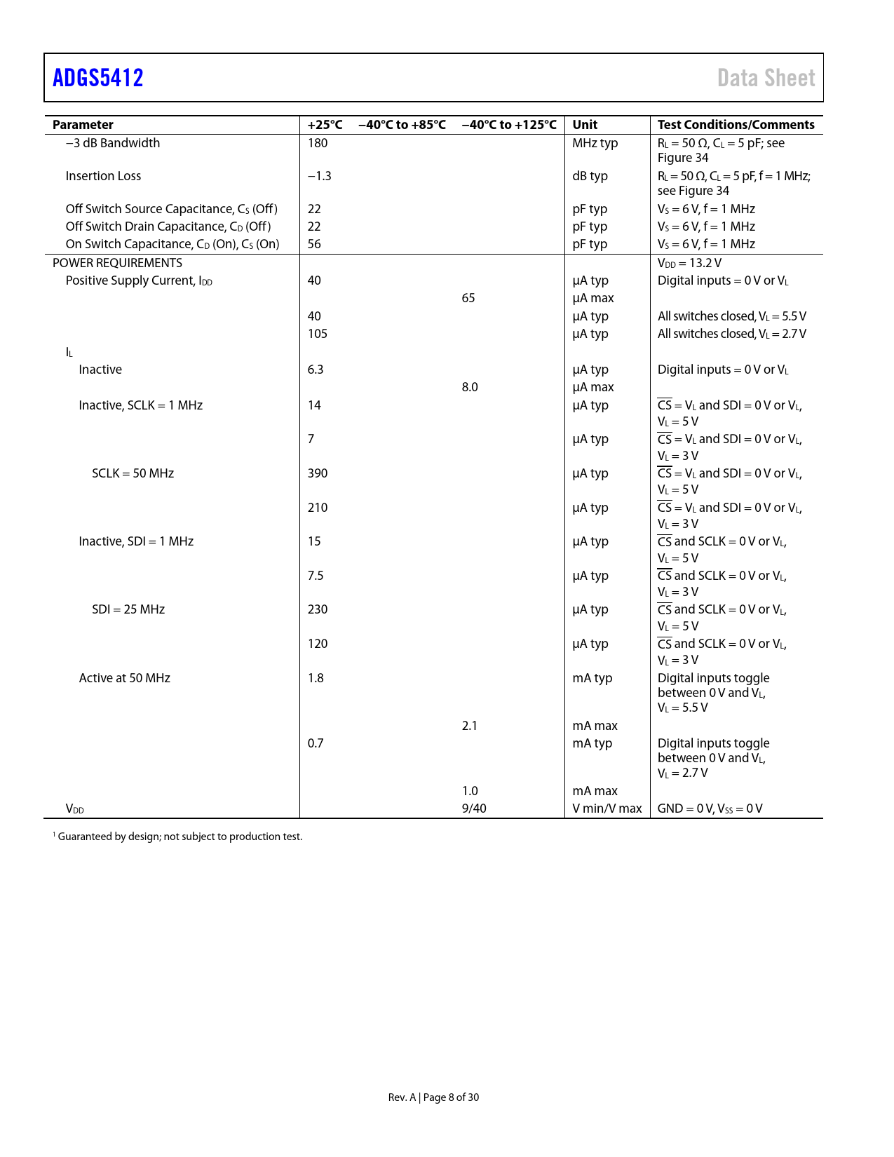 ADGS5412. Data Sheet. Parameter. +25°C −40°C to +85°C −40°C to +125°C Unit. Test Conditions/Comments