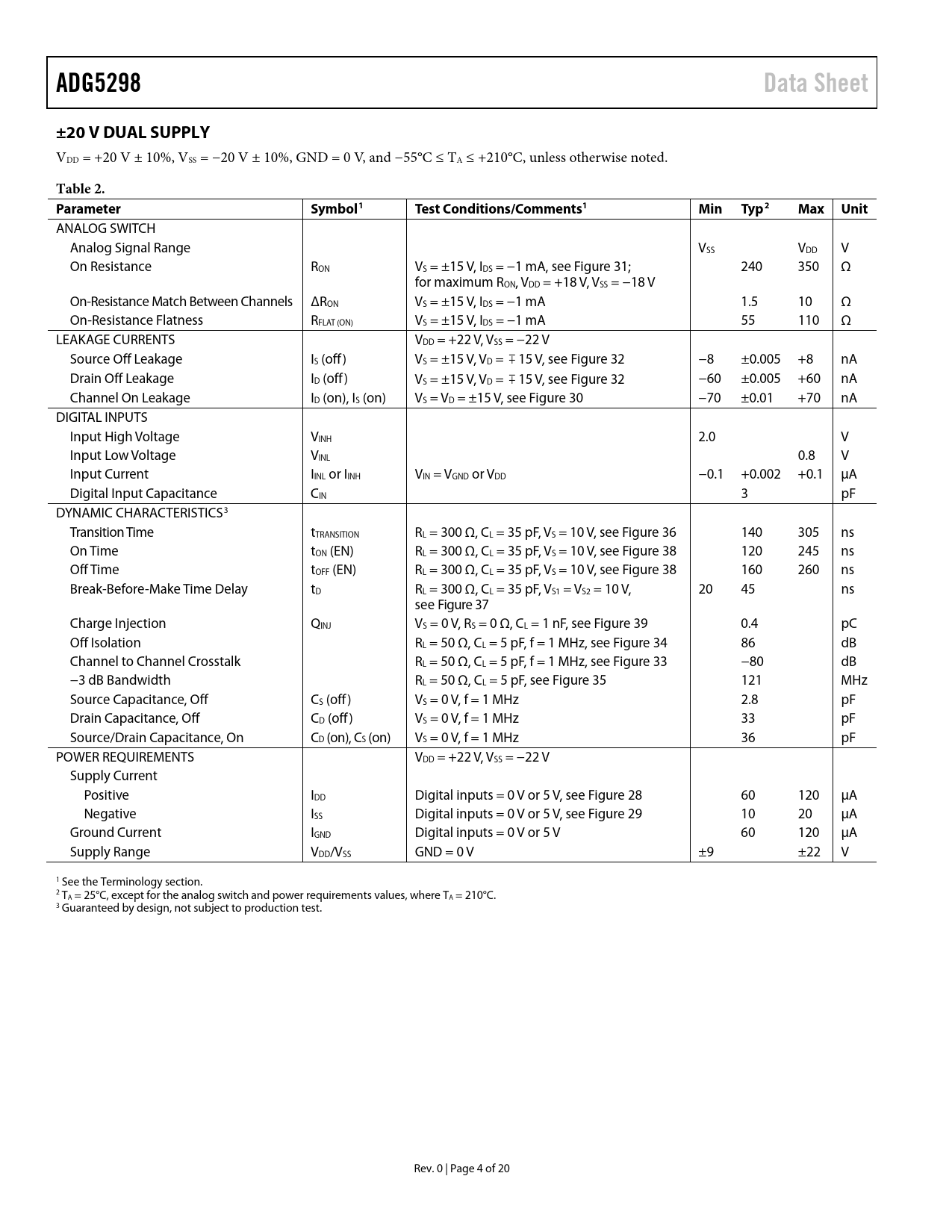 link to page 14 link to page 14 link to page 14 link to page 14 link to page 15 link to page 15 link to page 15 link to page 15 link to page 15 link to page 14 link to page 14 link to page 14 link to page 13 link to page 13 link to page 16 ADG5298Data Sheet±20 V DUAL SUPPLY VDD = +20 V ± 10%, VSS = −20 V ± 10%, GND = 0 V, and −55°C ≤ TA ≤ +210°C, unless otherwise noted. Table 2. ParameterSymbol1Test Conditions/Comments1Min Typ2Max Unit ANALOG SWITCH Analog Signal Range VSS VDD V On Resistance RON VS = ±15 V, IDS = −1 mA, see Figure 31; 240 350 Ω for maximum RON, VDD = +18 V, VSS = −18 V On-Resistance Match Between Channels ΔRON VS = ±15 V, IDS = −1 mA 1.5 10 Ω On-Resistance Flatness RFLAT (ON) VS = ±15 V, IDS = −1 mA 55 110 Ω LEAKAGE CURRENTS VDD = +22 V, VSS = −22 V Source Off Leakage IS (off) VS = ±15 V, VD = 15 V, see Figure 32 −8 ±0.005 +8 nA Drain Off Leakage ID (off) VS = ±15 V, VD = 15 V, see Figure 32 −60 ±0.005 +60 nA Channel On Leakage ID (on), IS (on) VS = VD = ±15 V, see Figure 30 −70 ±0.01 +70 nA DIGITAL INPUTS Input High Voltage VINH 2.0 V Input Low Voltage VINL 0.8 V Input Current IINL or IINH VIN = VGND or VDD −0.1 +0.002 +0.1 µA Digital Input Capacitance CIN 3 pF DYNAMIC CHARACTERISTICS3 Transition Time tTRANSITION RL = 300 Ω, CL = 35 pF, VS = 10 V, see Figure 36 140 305 ns On Time tON (EN) RL = 300 Ω, CL = 35 pF, VS = 10 V, see Figure 38 120 245 ns Off Time tOFF (EN) RL = 300 Ω, CL = 35 pF, VS = 10 V, see Figure 38 160 260 ns Break-Before-Make Time Delay tD RL = 300 Ω, CL = 35 pF, VS1 = VS2 = 10 V, 20 45 ns see Figure 37 Charge Injection QINJ VS = 0 V, RS = 0 Ω, CL = 1 nF, see Figure 39 0.4 pC Off Isolation RL = 50 Ω, CL = 5 pF, f = 1 MHz, see Figure 34 86 dB Channel to Channel Crosstalk RL = 50 Ω, CL = 5 pF, f = 1 MHz, see Figure 33 −80 dB −3 dB Bandwidth RL = 50 Ω, CL = 5 pF, see Figure 35 121 MHz Source Capacitance, Off CS (off) VS = 0 V, f = 1 MHz 2.8 pF Drain Capacitance, Off CD (off) VS = 0 V, f = 1 MHz 33 pF Source/Drain Capacitance, On CD (on), CS (on) VS = 0 V, f = 1 MHz 36 pF POWER REQUIREMENTS VDD = +22 V, VSS = −22 V Supply Current Positive IDD Digital inputs = 0 V or 5 V, see Figure 28 60 120 µA Negative ISS Digital inputs = 0 V or 5 V, see Figure 29 10 20 µA Ground Current IGND Digital inputs = 0 V or 5 V 60 120 µA Supply Range VDD/VSS GND = 0 V ±9 ±22 V 1 See the Terminology section. 2 TA = 25°C, except for the analog switch and power requirements values, where TA = 210°C. 3 Guaranteed by design, not subject to production test. Rev. 0 | Page 4 of 20 Document Outline FEATURES APPLICATIONS GENERAL DESCRIPTION FUNCTIONAL BLOCK DIAGRAM PRODUCT HIGHLIGHTS TABLE OF CONTENTS REVISION HISTORY SPECIFICATIONS ±15 V DUAL-SUPPLY ±20 V DUAL SUPPLY 12 V SINGLE SUPPLY 36 V SINGLE SUPPLY CONTINUOUS CURRENT PER CHANNEL (Sx OR D) ABSOLUTE MAXIMUM RATINGS THERMAL RESISTANCE ESD CAUTION PIN CONFIGURATIONS AND FUNCTION DESCRIPTIONS TYPICAL PERFORMANCE CHARACTERISTICS TEST CIRCUITS TERMINOLOGY THEORY OF OPERATION TRENCH ISOLATION APPLICATIONS INFORMATION OUTLINE DIMENSIONS ORDERING GUIDE