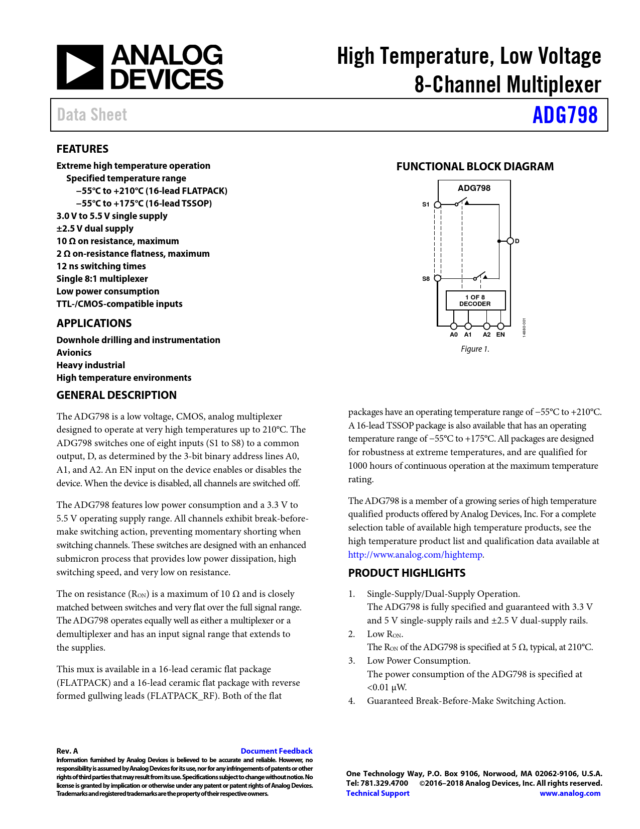 High Temperature, Low Voltage. 8-Channel Multiplexer. Data Sheet. ADG798. FEATURES. Extreme high temperature operation