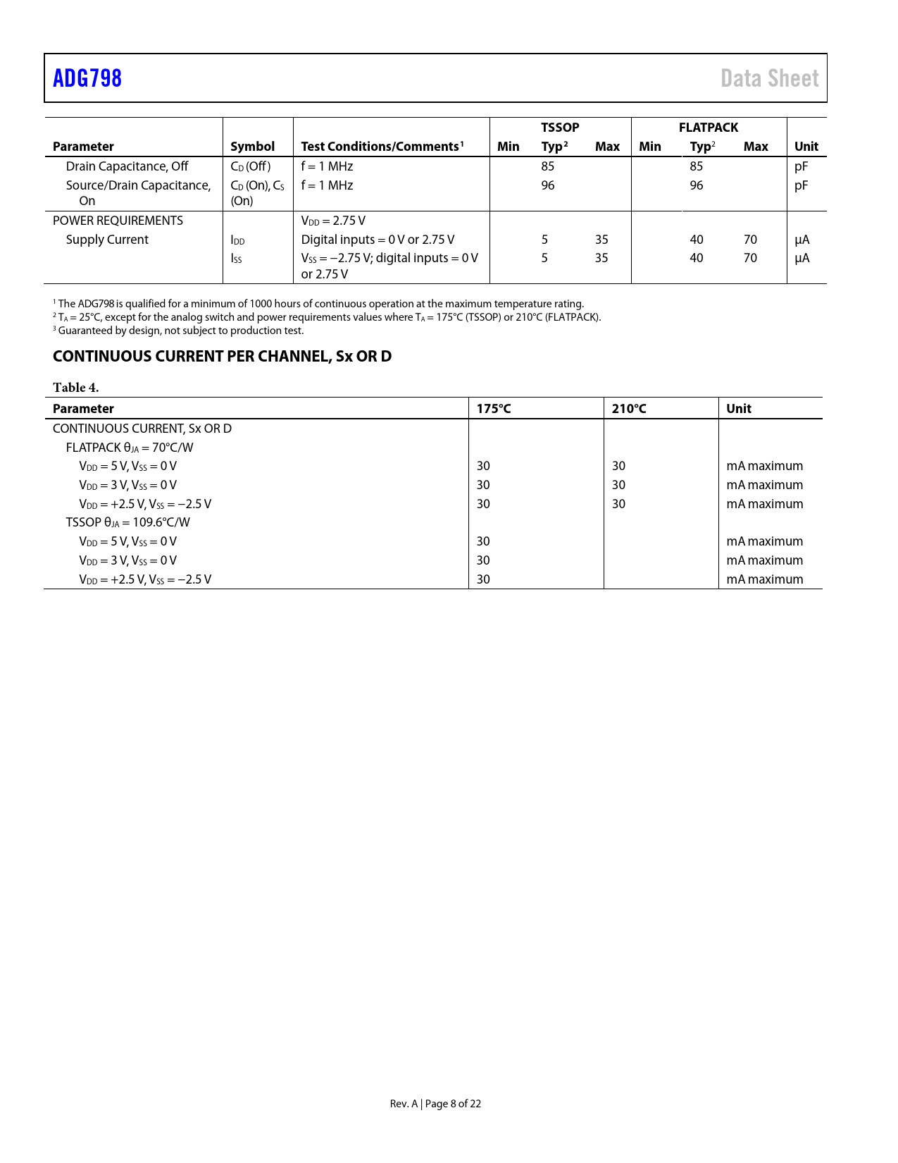 ADG798Data SheetTSSOPFLATPACKParameterSymbolTest Conditions/Comments1MinTyp2MaxMinTyp 2 MaxUnit Drain Capacitance, Off CD (Off) f = 1 MHz 85 85 pF Source/Drain Capacitance, CD (On), CS f = 1 MHz 96 96 pF On (On) POWER REQUIREMENTS VDD = 2.75 V Supply Current IDD Digital inputs = 0 V or 2.75 V 5 35 40 70 μA ISS VSS = −2.75 V; digital inputs = 0 V 5 35 40 70 μA or 2.75 V 1 The ADG798 is qualified for a minimum of 1000 hours of continuous operation at the maximum temperature rating. 2 TA = 25°C, except for the analog switch and power requirements values where TA = 175°C (TSSOP) or 210°C (FLATPACK). 3 Guaranteed by design, not subject to production test. CONTINUOUS CURRENT PER CHANNEL, Sx OR DTable 4. Parameter175°C210°CUnit CONTINUOUS CURRENT, Sx OR D FLATPACK θJA = 70°C/W VDD = 5 V, VSS = 0 V 30 30 mA maximum VDD = 3 V, VSS = 0 V 30 30 mA maximum VDD = +2.5 V, VSS = −2.5 V 30 30 mA maximum TSSOP θJA = 109.6°C/W VDD = 5 V, VSS = 0 V 30 mA maximum VDD = 3 V, VSS = 0 V 30 mA maximum VDD = +2.5 V, VSS = −2.5 V 30 mA maximum Rev. A | Page 8 of 22 Document Outline FEATURES APPLICATIONS FUNCTIONAL BLOCK DIAGRAM GENERAL DESCRIPTION PRODUCT HIGHLIGHTS TABLE OF CONTENTS REVISION HISTORY SPECIFICATIONS DUAL SUPPLY CONTINUOUS CURRENT PER CHANNEL, Sx OR D ABSOLUTE MAXIMUM RATINGS THERMAL RESISTANCE ESD CAUTION PIN CONFIGURATION AND FUNCTION DESCRIPTIONS TRUTH TABLE TYPICAL PERFORMANCE CHARACTERISTICS TEST CIRCUITS TERMINOLOGY THEORY OF OPERATION APPLICATIONS INFORMATION POWER SUPPLY SEQUENCING OUTLINE DIMENSIONS ORDERING GUIDE
