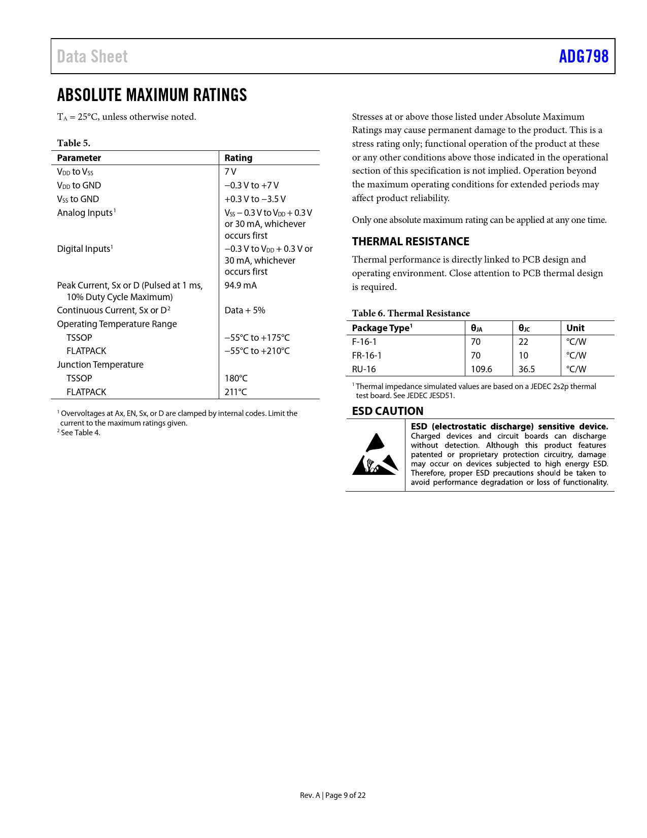 link to page 8 Data SheetADG798ABSOLUTE MAXIMUM RATINGS TA = 25°C, unless otherwise noted. Stresses at or above those listed under Absolute Maximum Ratings may cause permanent damage to the product. This is a Table 5. stress rating only; functional operation of the product at these ParameterRating or any other conditions above those indicated in the operational VDD to VSS 7 V section of this specification is not implied. Operation beyond VDD to GND −0.3 V to +7 V the maximum operating conditions for extended periods may VSS to GND +0.3 V to −3.5 V affect product reliability. Analog Inputs1 VSS − 0.3 V to VDD + 0.3 V or 30 mA, whichever Only one absolute maximum rating can be applied at any one time. occurs first THERMAL RESISTANCE Digital Inputs1 −0.3 V to VDD + 0.3 V or 30 mA, whichever Thermal performance is directly linked to PCB design and occurs first operating environment. Close attention to PCB thermal design Peak Current, Sx or D (Pulsed at 1 ms, 94.9 mA is required. 10% Duty Cycle Maximum) Continuous Current, Sx or D2 Data + 5% Table 6. Thermal Resistance Operating Temperature Range Package Type1θJAθJCUnit TSSOP −55°C to +175°C F-16-1 70 22 °C/W FLATPACK −55°C to +210°C FR-16-1 70 10 °C/W Junction Temperature RU-16 109.6 36.5 °C/W TSSOP 180°C 1 FLATPACK 211°C Thermal impedance simulated values are based on a JEDEC 2s2p thermal test board. See JEDEC JESD51. 1 Overvoltages at Ax, EN, Sx, or D are clamped by internal codes. Limit the ESD CAUTION current to the maximum ratings given. 2 See Table 4. Rev. A | Page 9 of 22 Document Outline FEATURES APPLICATIONS FUNCTIONAL BLOCK DIAGRAM GENERAL DESCRIPTION PRODUCT HIGHLIGHTS TABLE OF CONTENTS REVISION HISTORY SPECIFICATIONS DUAL SUPPLY CONTINUOUS CURRENT PER CHANNEL, Sx OR D ABSOLUTE MAXIMUM RATINGS THERMAL RESISTANCE ESD CAUTION PIN CONFIGURATION AND FUNCTION DESCRIPTIONS TRUTH TABLE TYPICAL PERFORMANCE CHARACTERISTICS TEST CIRCUITS TERMINOLOGY THEORY OF OPERATION APPLICATIONS INFORMATION POWER SUPPLY SEQUENCING OUTLINE DIMENSIONS ORDERING GUIDE