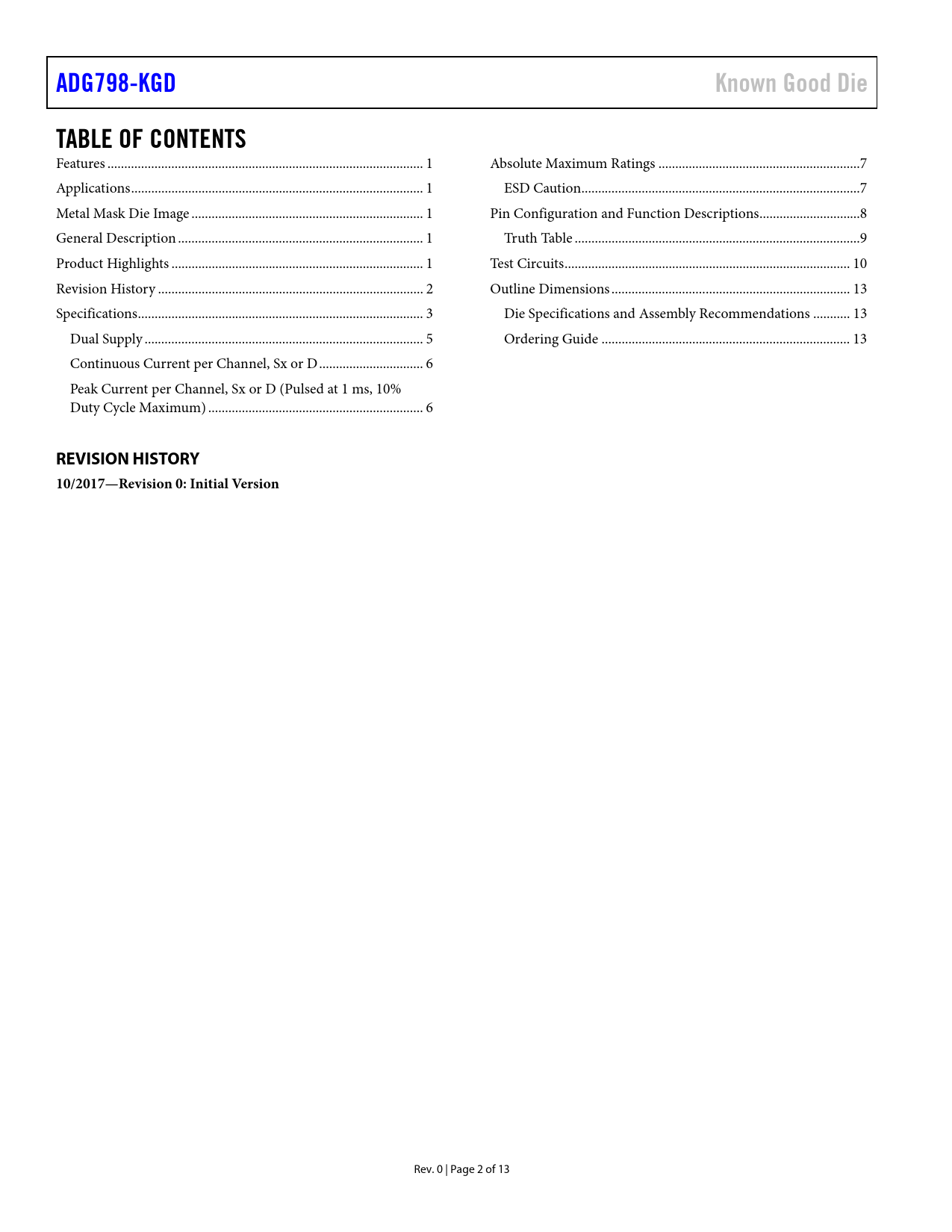 Páginas / Página13 / 2 — ADG798-KGD. Known Good Die. TABLE OF CONTENTS. REVISION HISTORY. …