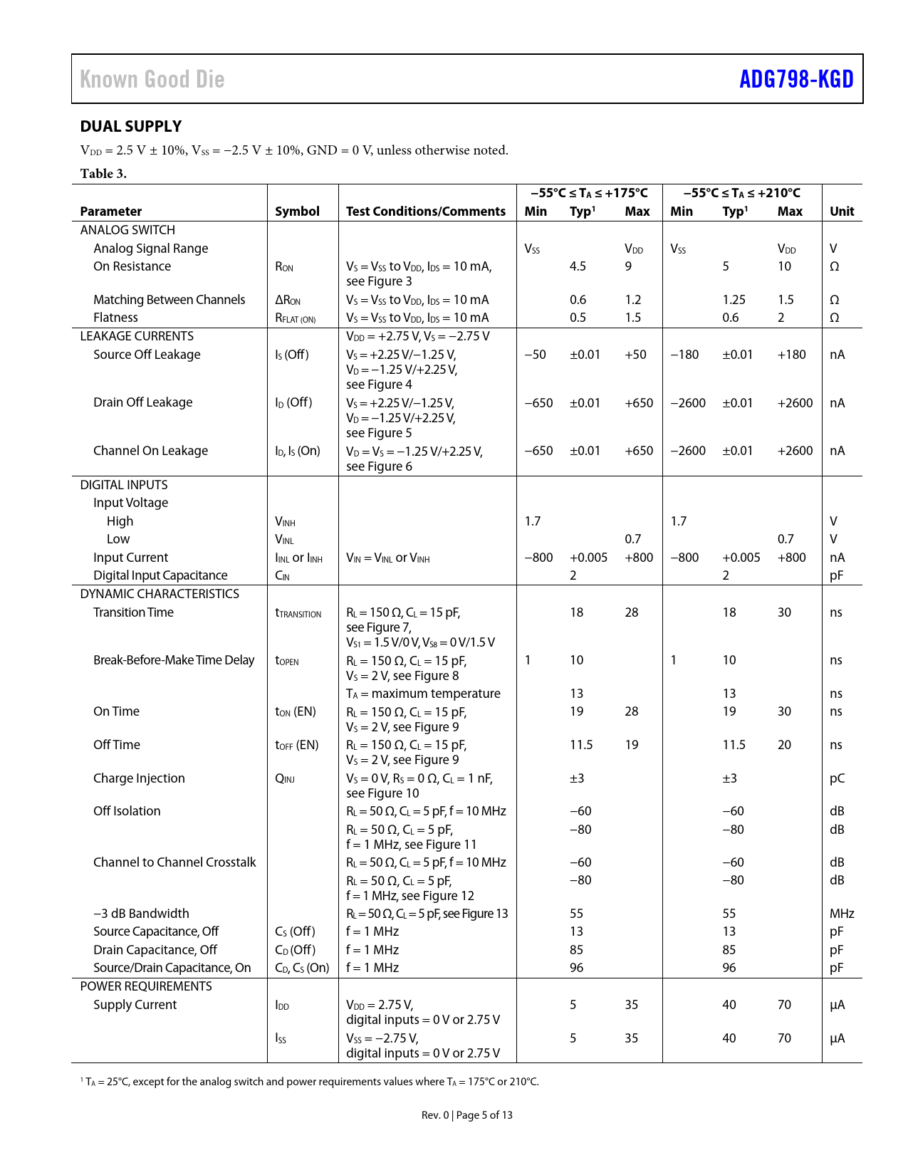 Known Good Die. ADG798-KGD. DUAL SUPPLY. Table 3. −55°C. TA ≤ +175°C. −55°C ≤ TA ≤ +210°C. Parameter. Symbol. Test Conditions/Comments. Min